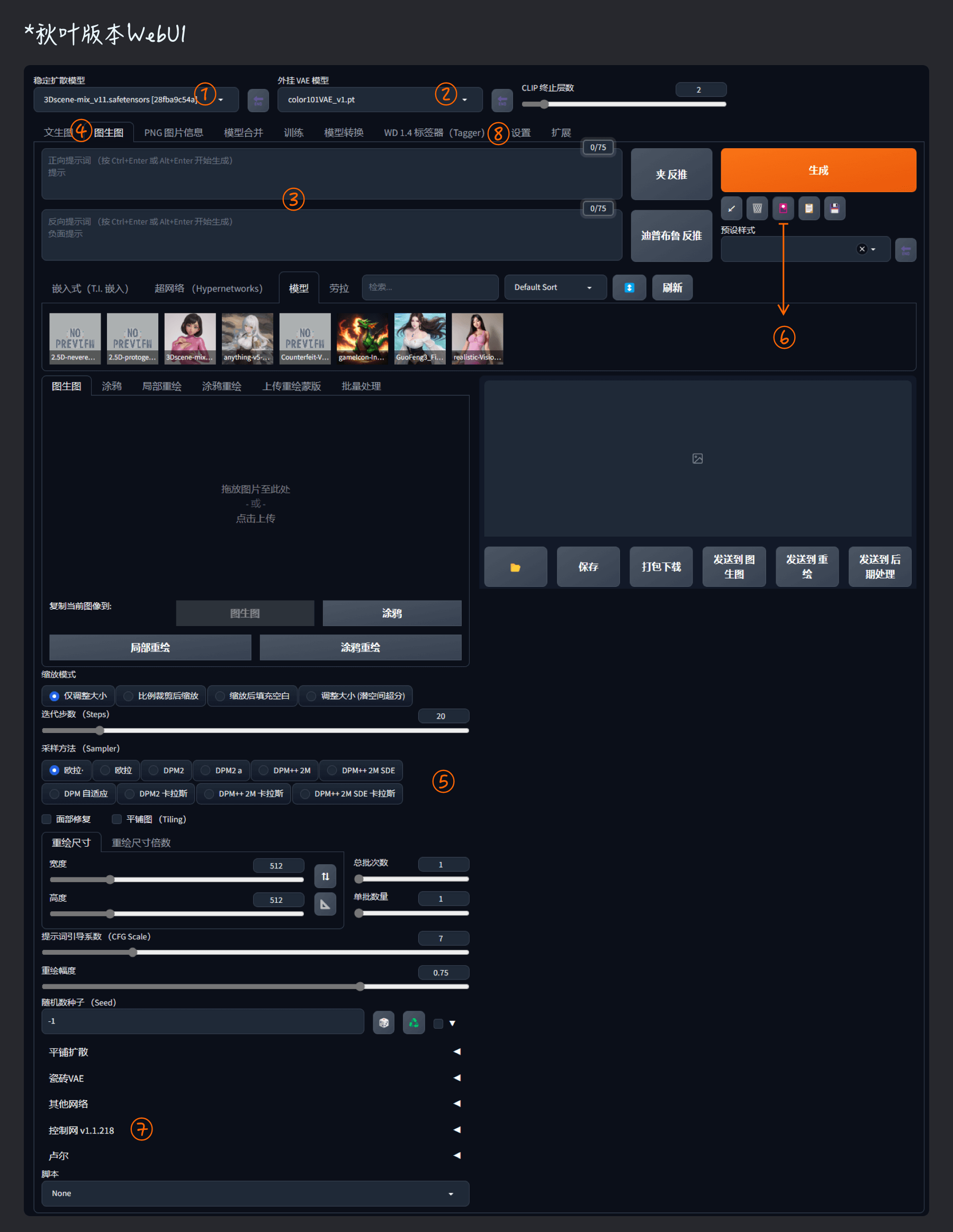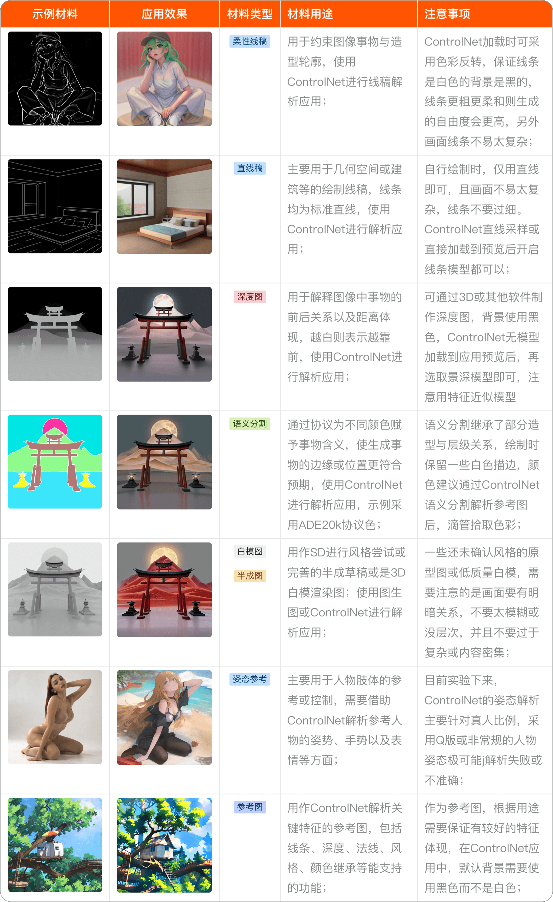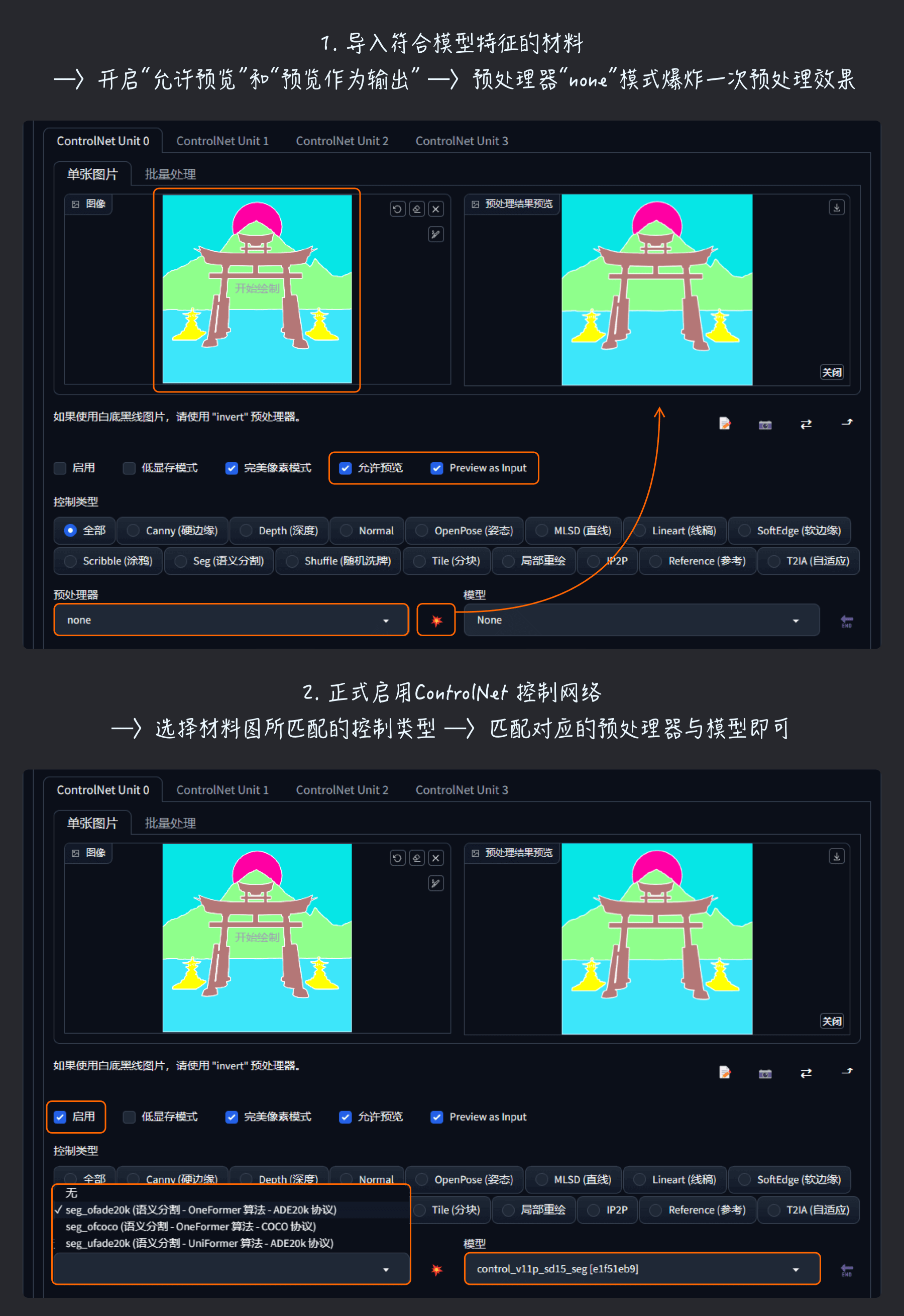 SD功能允许的条件下,经过反复尝试,前期的草稿材料可准备如下;部分需要采用ControlNet扩展进行解析应用,方法就是制作与ControlNet模型匹配的材料,导入到预览作为输出后再启用对应模型即可,方法如下图所示,亲测有效;
