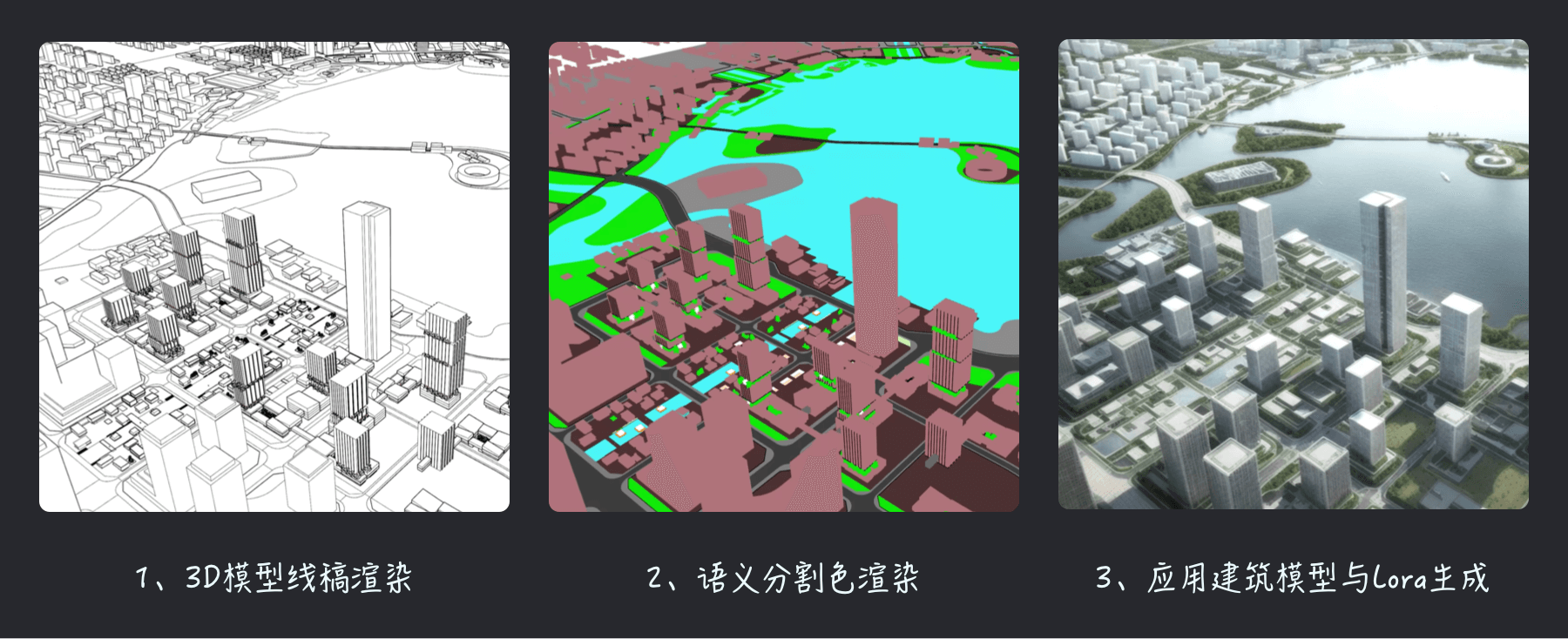 以ControlNet中的深度、法线来讲,其实都不是什么新鲜技术,在3D设计工具中都很常见,这也意味着在应用SD的过程中,我们可以根据预期在其他软件中完成起手材料来辅助SD生成,这里我放了一个在B站上看见的应用案例,其中就是借助3D软件完成了基础的城市地编,然后根据ControlNet的语义分割协议对地编建筑进行了色彩渲染,之后就是导入到SD进行生成以填充相应的细节;