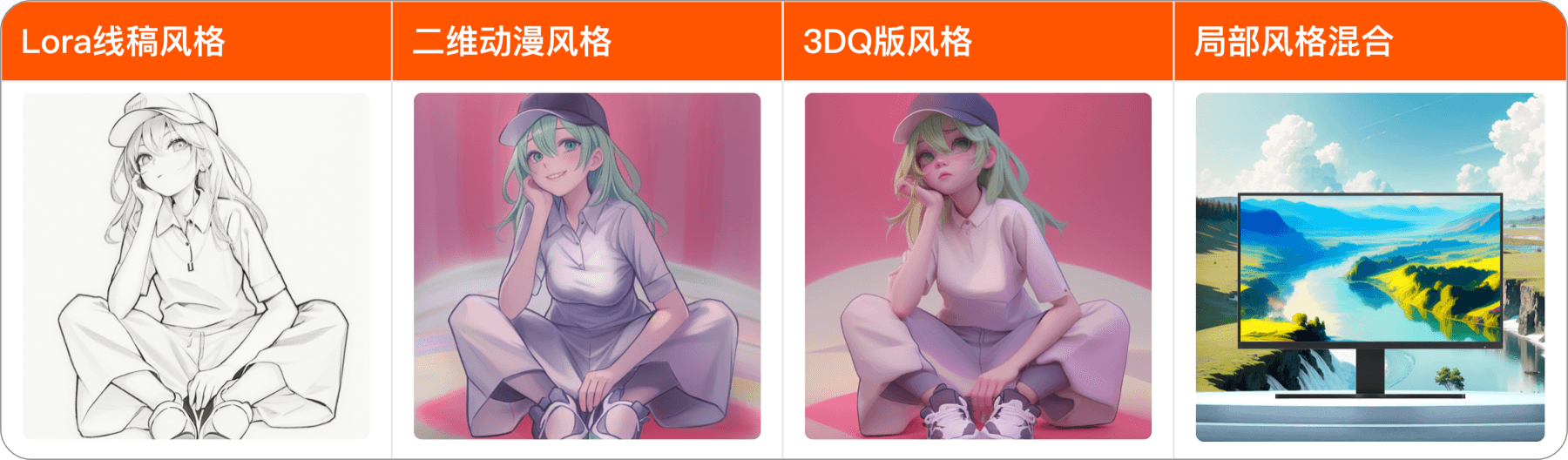 3D、2.5D、2D、CG、吉卜力风格(Ghibli style)、水彩(Watercolor)、波普艺术(Pop Art)、中国风(Chinese Fashion)、朋克风(Cyberpunk)、噪点插画(Noise Design)、像素风(16-bit pixel art)、迪士尼风(Disney Style)、Q版风(Q-Style)等