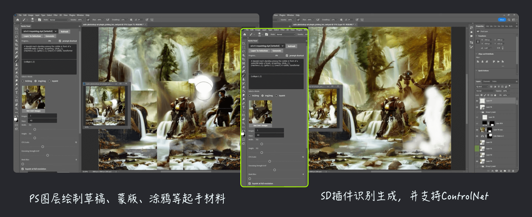 不止3D软件,我们喜闻乐见的PS其实也支持SD的扩展应用了,这意味着你可以直接在PS中进行更精准的涂绘、制作蒙版、绘制草稿等,加上Beta版PS自带的创意生成,或许我们可以让AIGC绘图之间碰撞出更多的可能性!