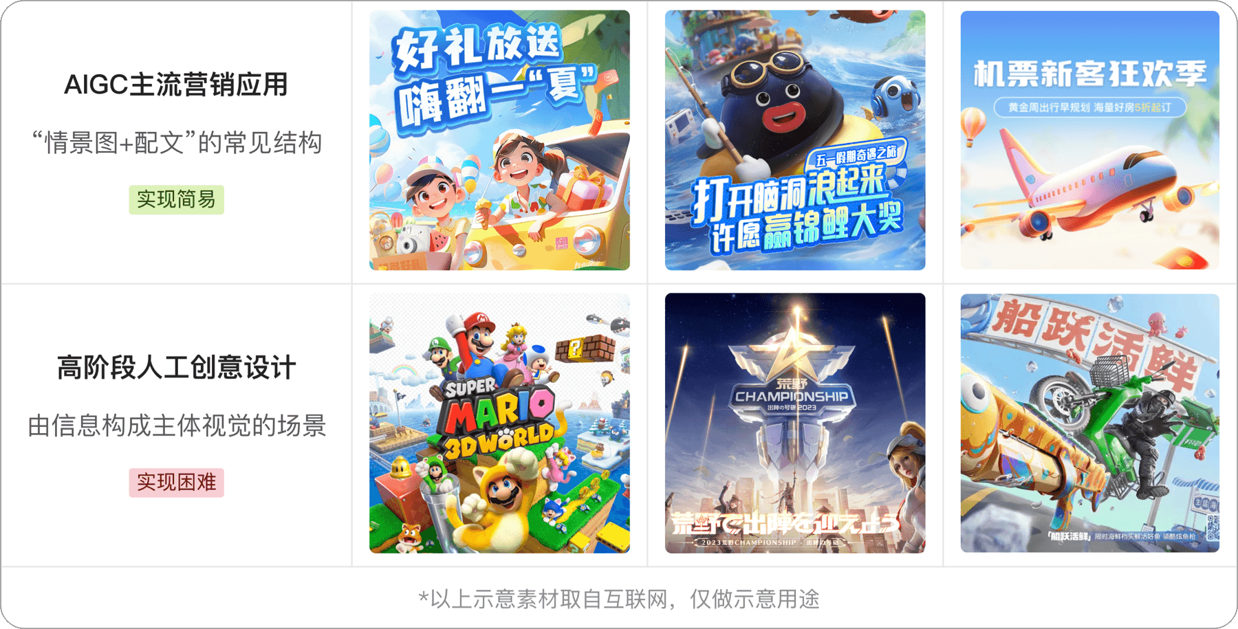 但由于现在的AIGC绘图对文本信息处理能力不佳,若你的主体视觉由信息构成并且嵌套在视觉场景之中,而不是处于前景、近景的层次那么就会比较难搞,也因此目前市面上主流的AIGC营销视觉案例基本都是“情景图+配文”的结构,两类应用场景如下;