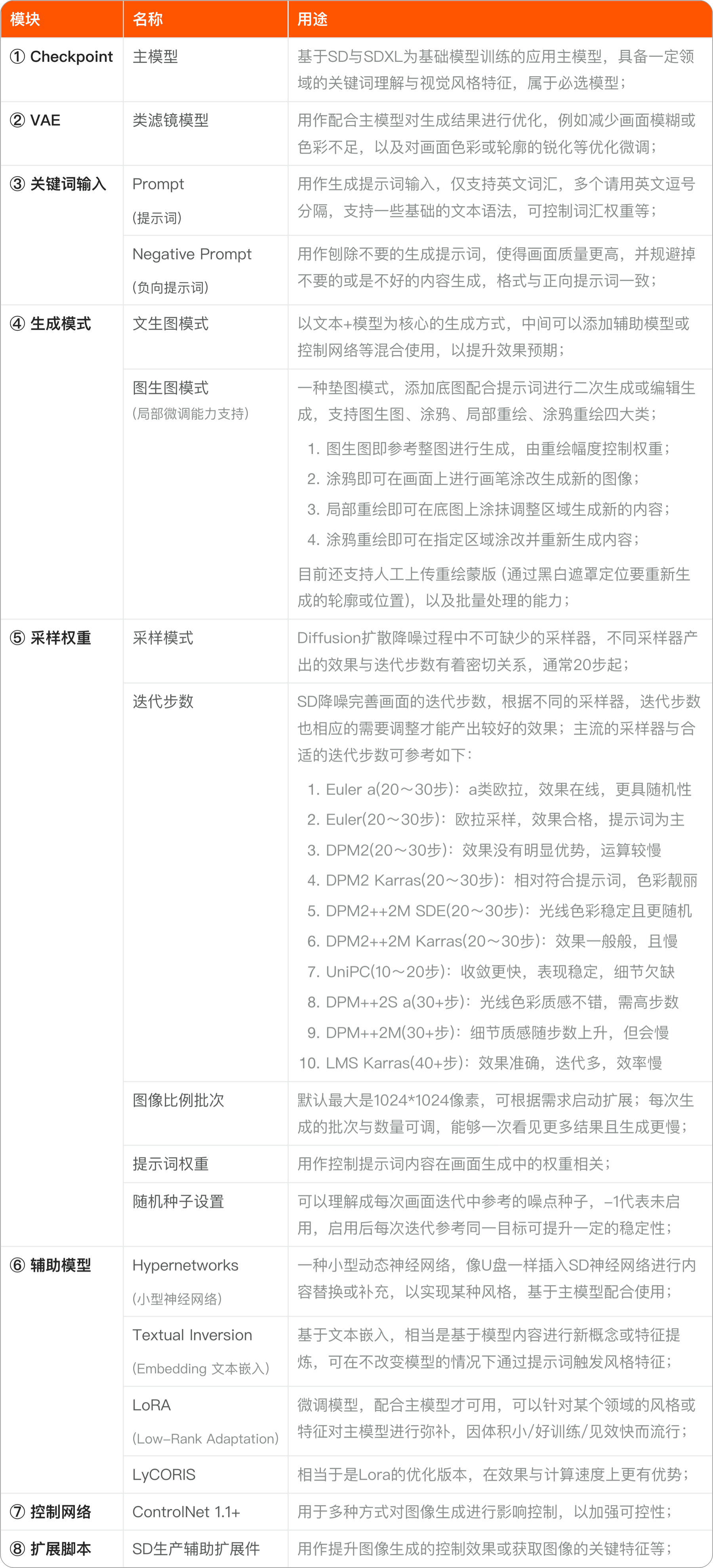 另外SD不同于Midjourney,由于是从主模型到扩展一层层混合作业的,想要基于同样的提示词实现抄作业不一定行的通,所以了解SD各种模型的关系与功能属性是很有必要的,以下是关于SD基本且主流功能的概述整理:
