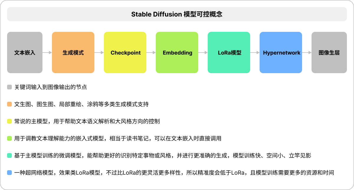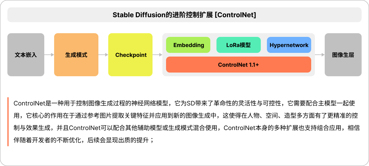 这个过程中,提示词是画面构成的重要因素,却不是画面风格和语义解析的全部,SD生成的可控性还需要借助各种扩展网络的应用,这意味完全一样的关键词出来的结果依旧可能天差地别,SD与扩展模型的运作模式可通过下图快速理解,它们逐级影响,相互作用;
