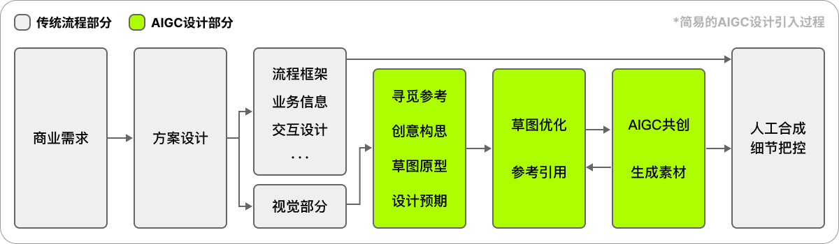 一方面因为SD通过简单的几个提示词并不能生成高质量效果,依靠随机抽卡是不可能实现商业需求的,另外作为商业设计,其中必然是带有商业目的与业务信息的,因此为了保障生成效果与效率,设计师还是要先根据需求建立设计预期,在脑子里形成设计方案后开始构建草图或参考材料,然后再拆解成多个阶段,把适合AIGC绘图处理的事项交出去,中间通过垫图或人工操作纠正方向,加速抽卡的方向聚焦,最终得到一些满意的材料,再做商业合成产出交付产物;