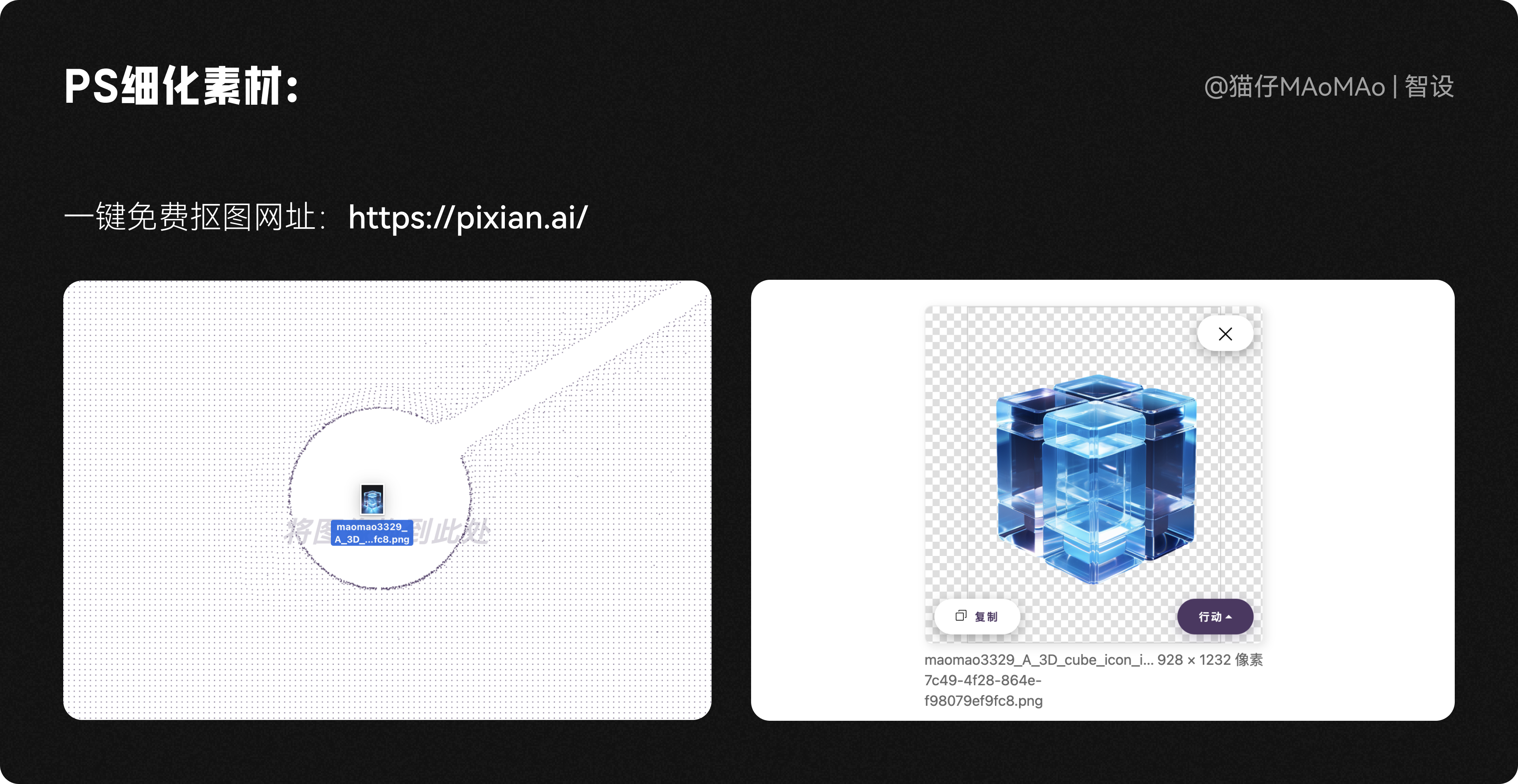 3D主视觉的部分,我们需要先进行抠图,如果不想使用 PS 手动抠图,这里推荐我常用的一键免费抠图网站:https://pixian.ai/ ,处理简单的图片,直接把图片扔进去就好了,简单好用~