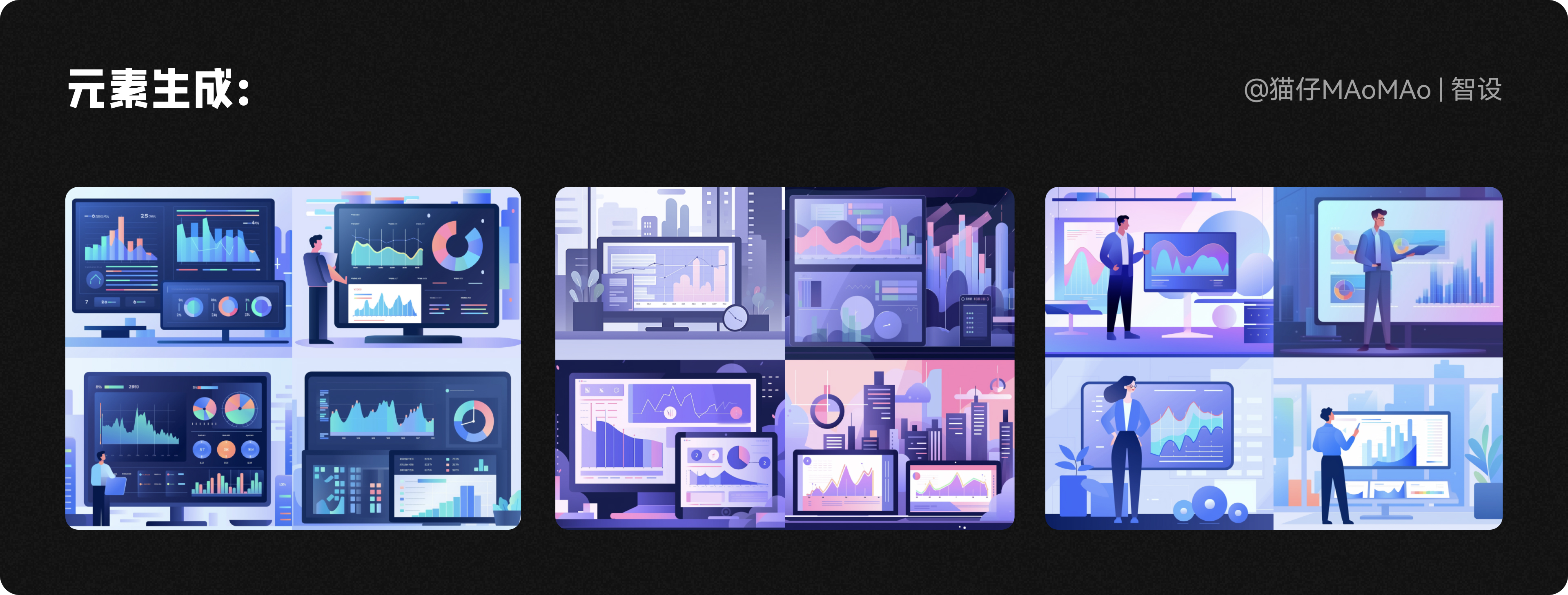 数据分析与可视化的背景,直接生成数据图表的效果并不是很理想,把办公室场景全部描绘出来生成的素材更加符合需求,但是还需要再手动对素材进行细化。