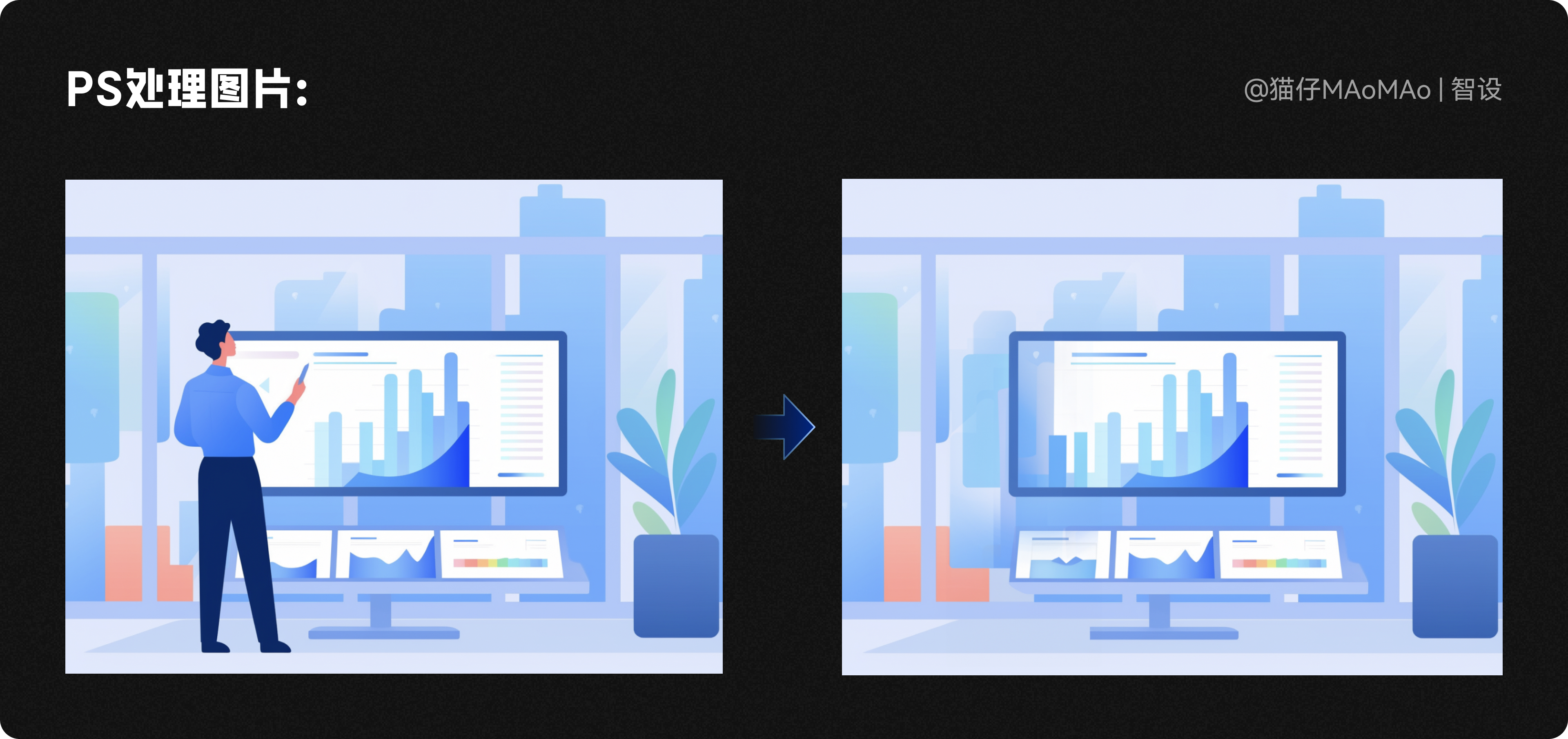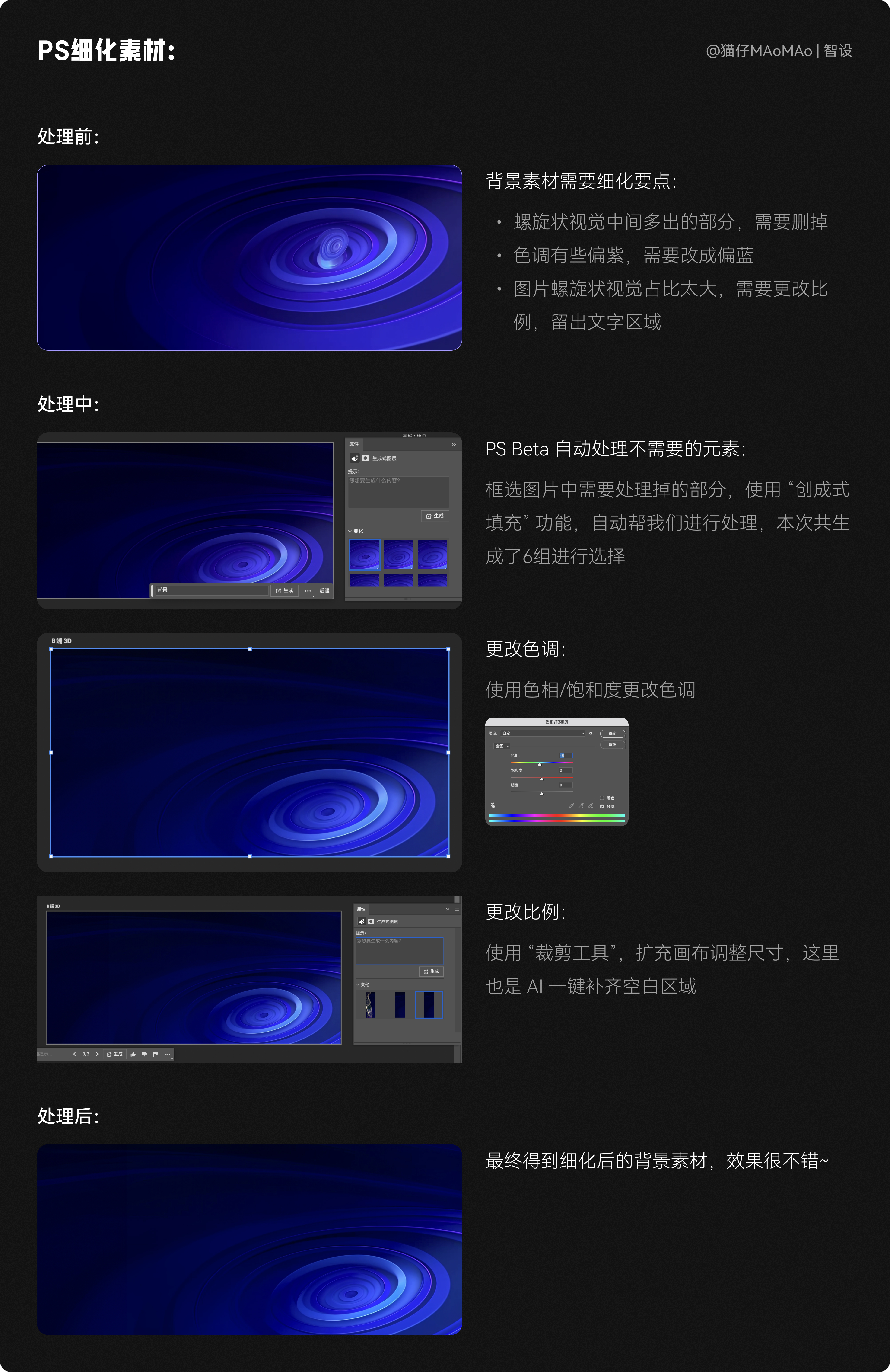生成的素材我们需要先用 PS 处理一下,背景素材需要处理的地方:主视觉多余的部分需要删掉、色调处理、图片比例修改。