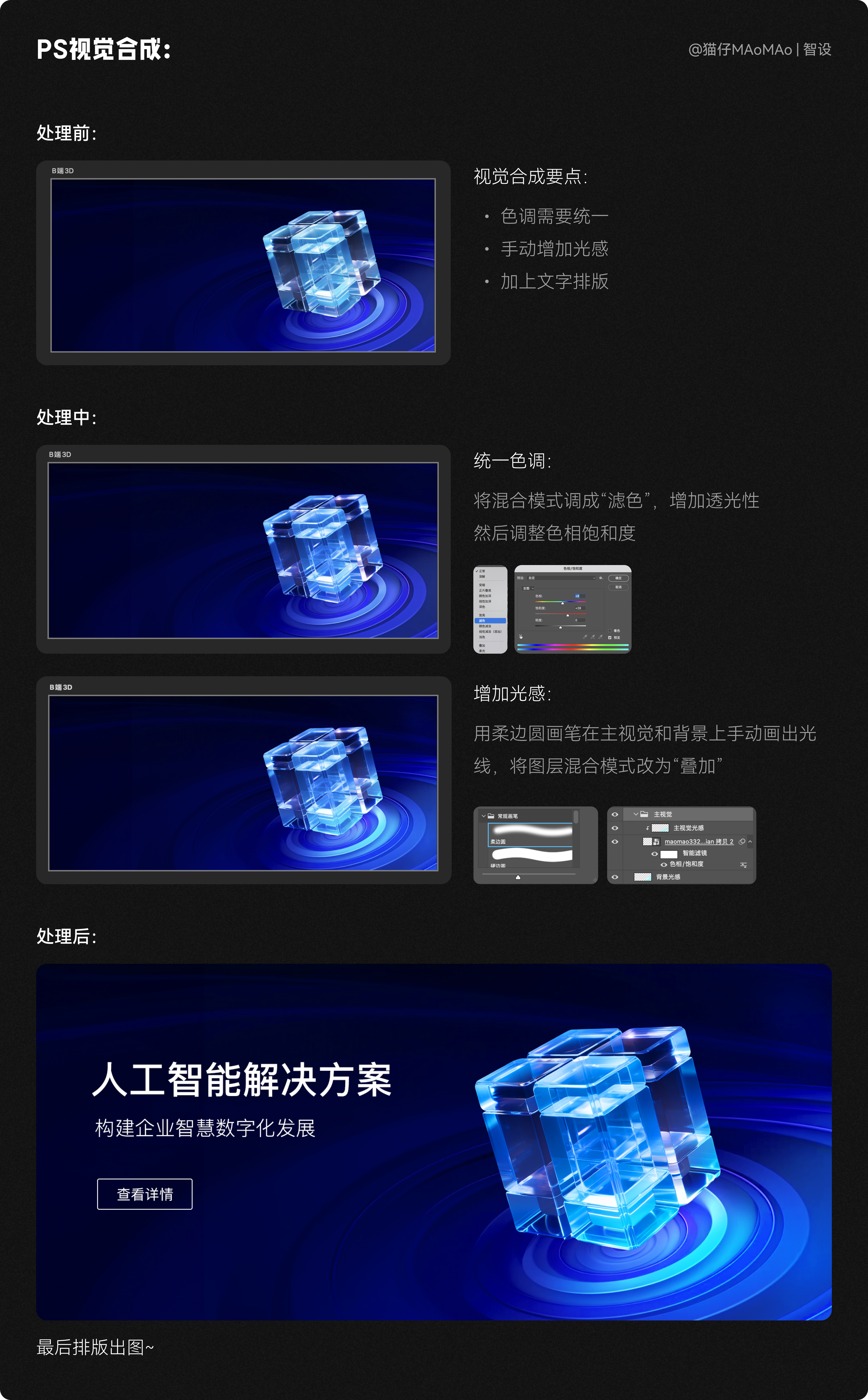 这一步考验的是设计师的审美和手活,我们需要把背景和主视觉素材,进行视觉合成,其实也非常简单:这里我定的主要色调是蓝色+青色的光感,首先需要将色调整体统一;然后想要表现出玻璃质感的通透,我们需要加上一些光感;最后文字排版出图即可~
