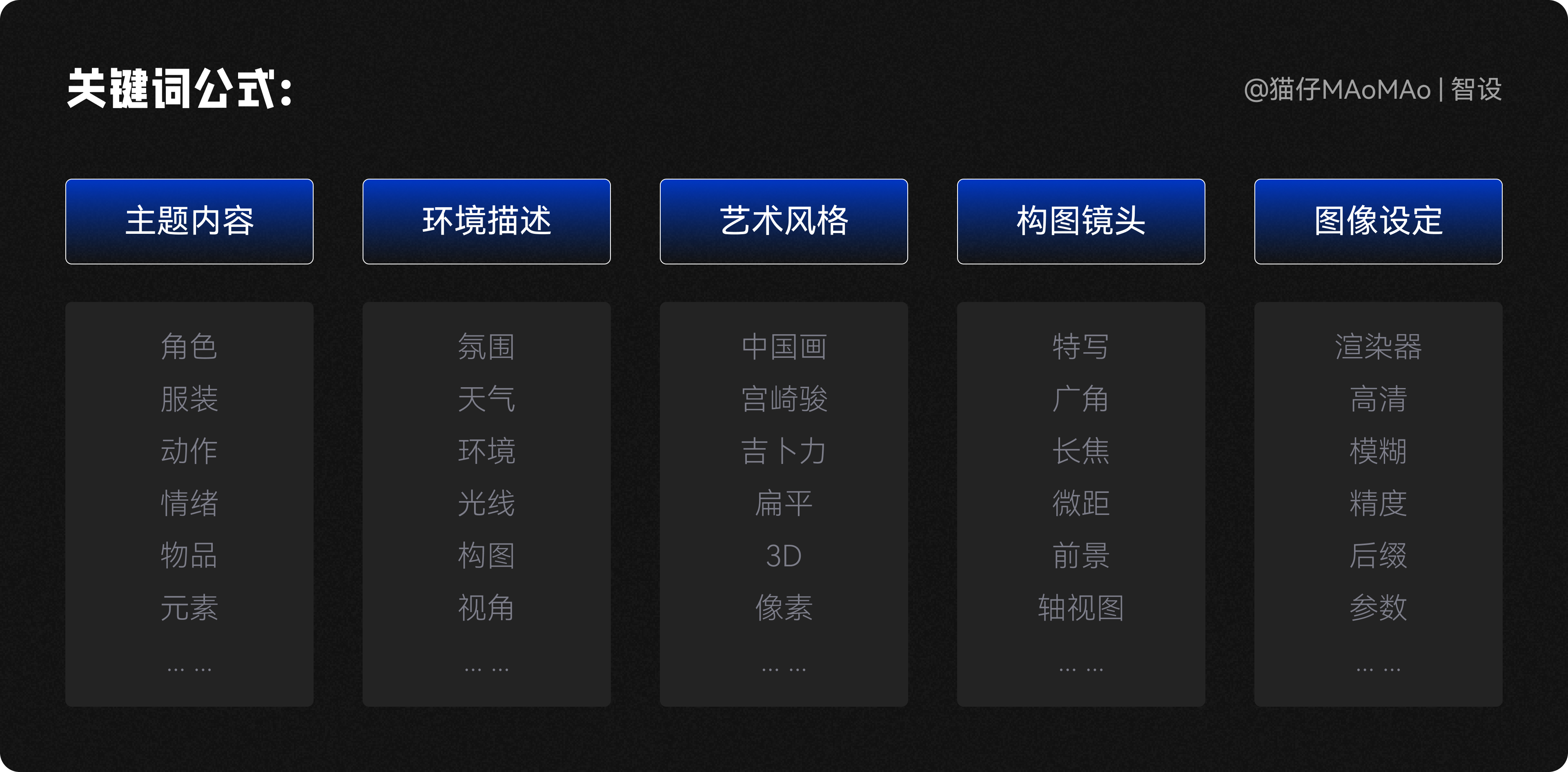 3D主视觉我们采用文生图的方式制作,写关键词的基本公式参考下图,具体写关键词时,需要灵活进行增减,然后不断尝试,直到出现自己满意的效果。