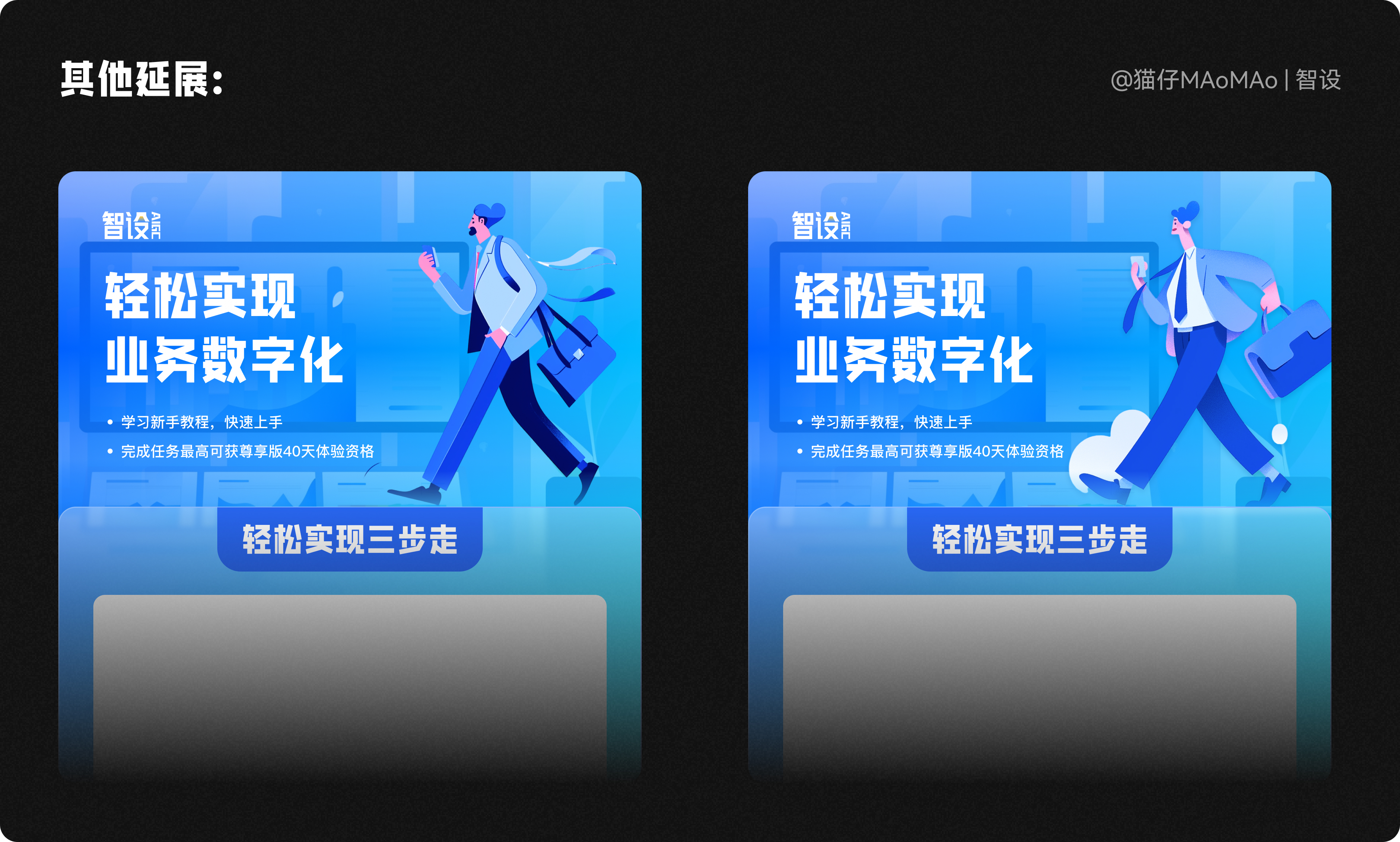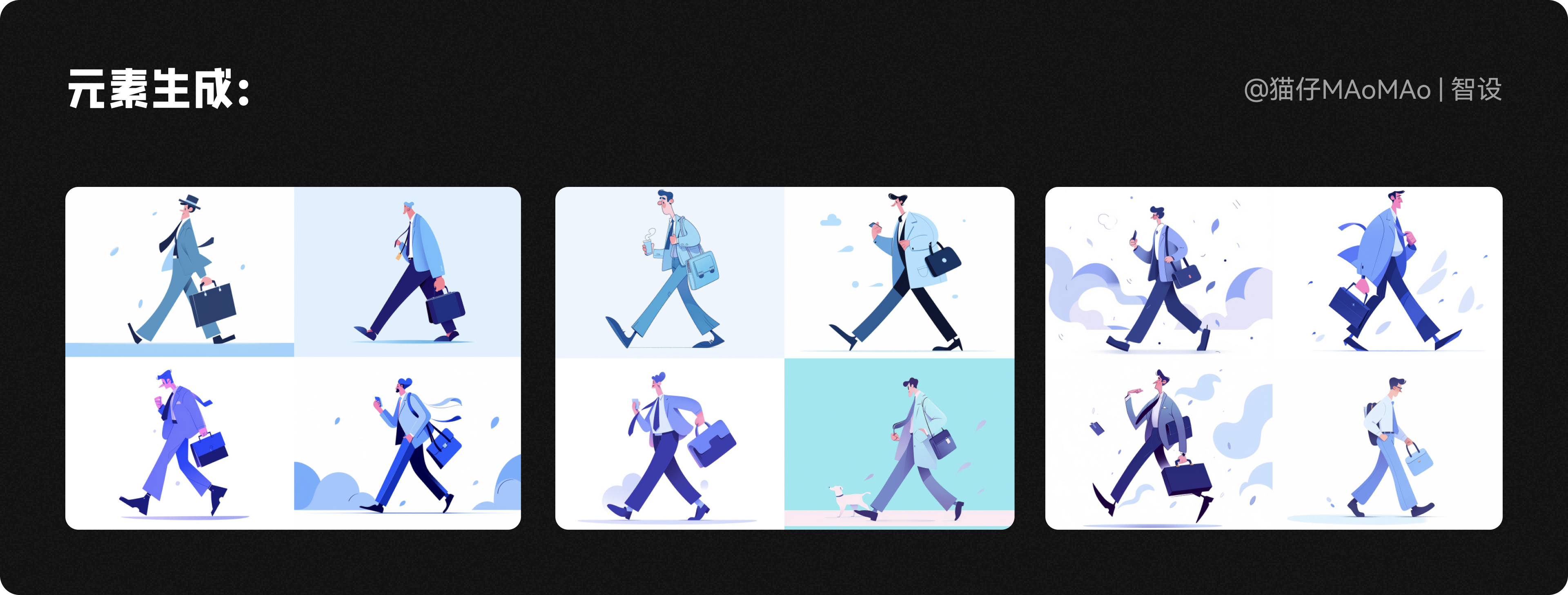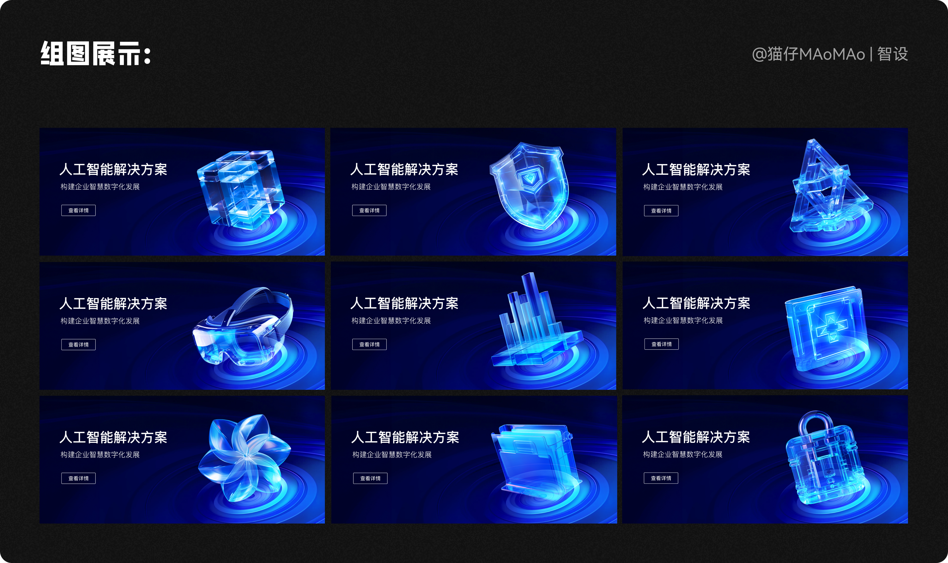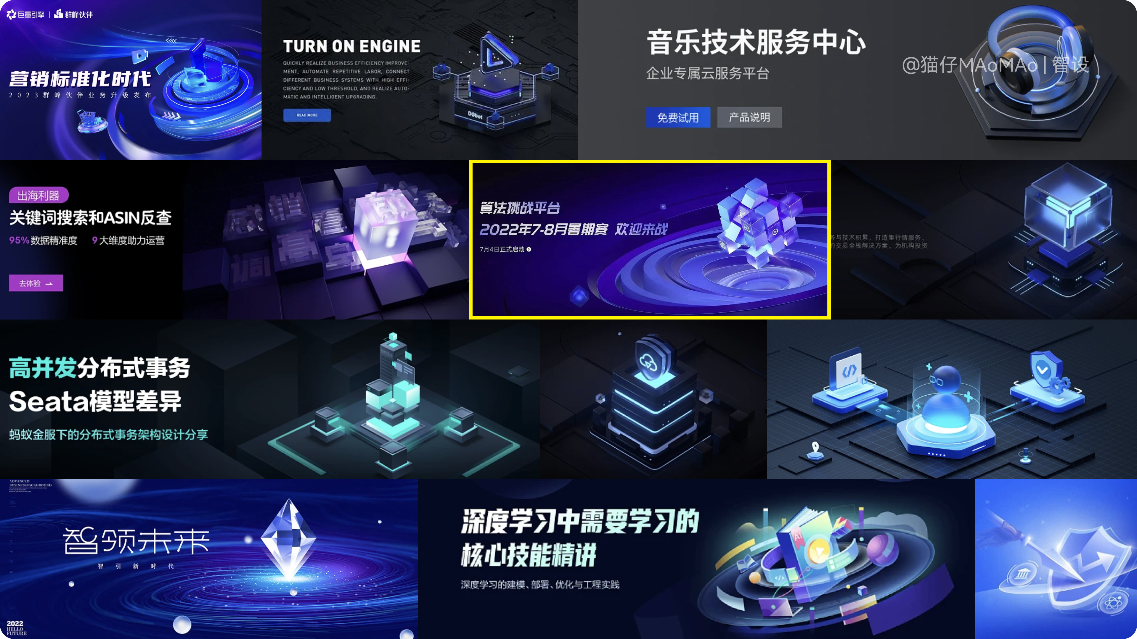 一般我们生成B端视觉,都是banner组图等,不是单张出现,想要保持风格不变的同时,主题内容不同,只需要更改主体关键词即可实现,最终我们就得到了下图需要的所有主视觉元素。
