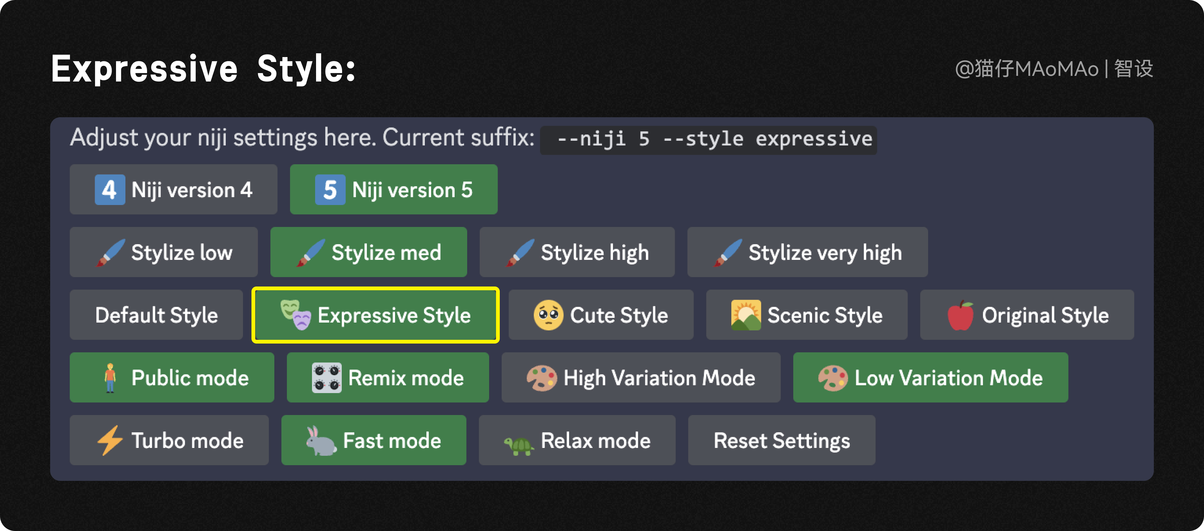 因为是单个元素生成,背景环境关键词可以省略,大家在编写关键词时,注意灵活增减,不用一定按照所谓的公式来写,艺术风格是插画素材,我们直接使用niji模型,其中expressive风格会让插画更加富有表现力,可以直接在关键词后面加上后缀“--style expressive ”,或者用“/settings”命令,更改设置。