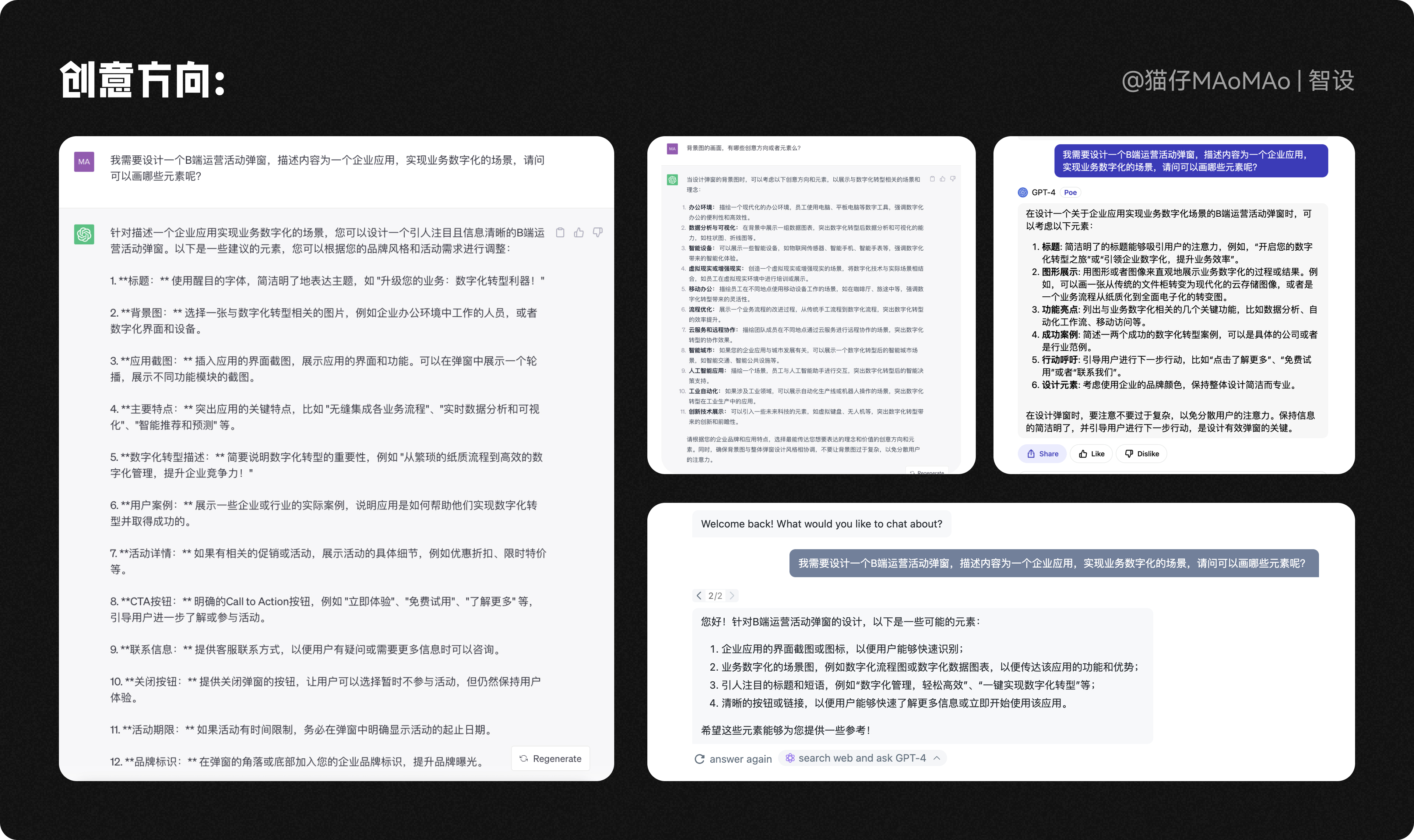 在没有设计方向的时候,不妨让AI大语言模型来帮助我们,它会根据需求的业务场景,给出合理的内容建议,以及画面元素的建议。