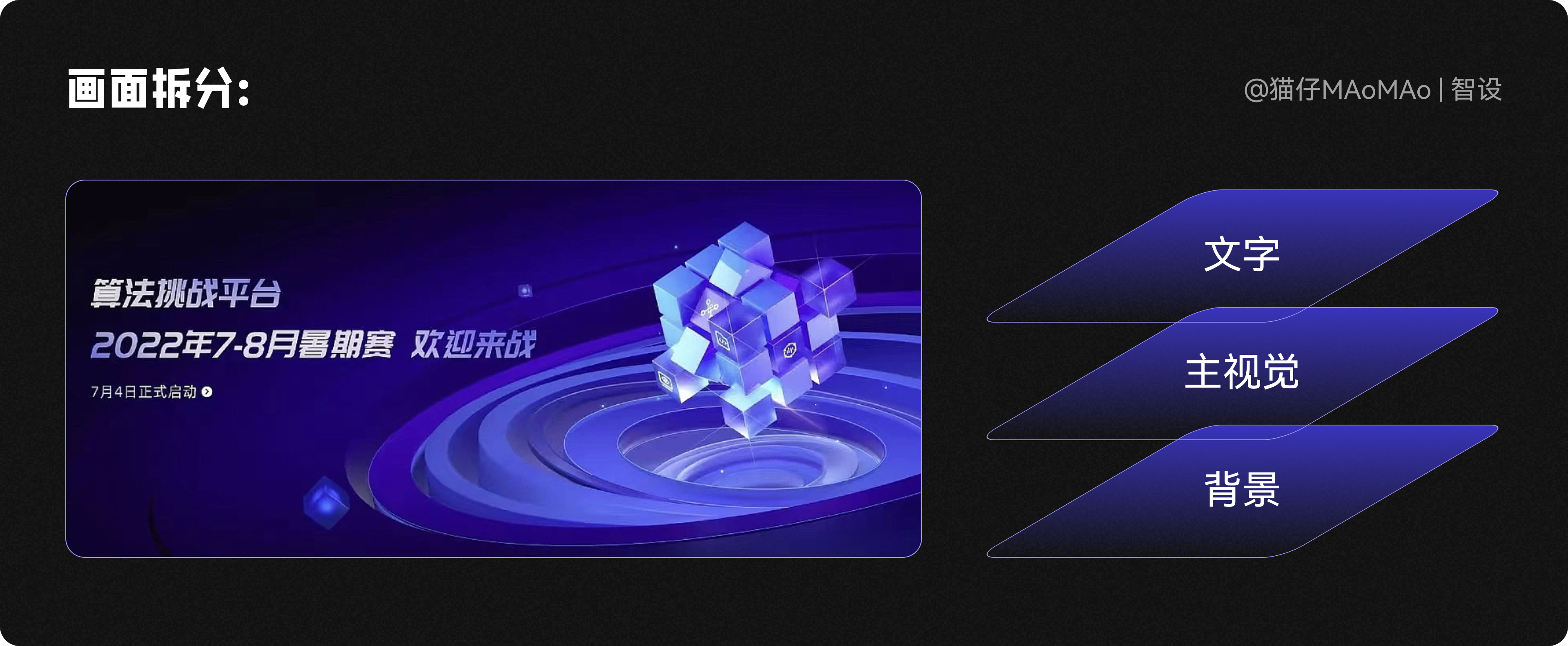 确定参考方向后,脑袋里面大致有了画面思路,主视觉在画面右方,螺旋状背景突出主视觉,文字排版在左边,整体色调为蓝色+青色光感。这里我们对所选参考图进行拆分: