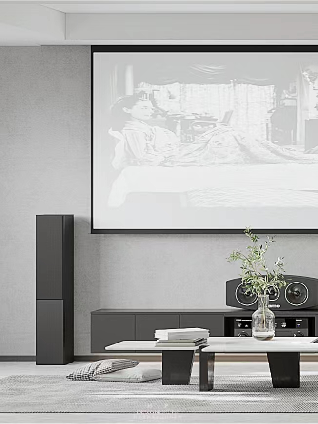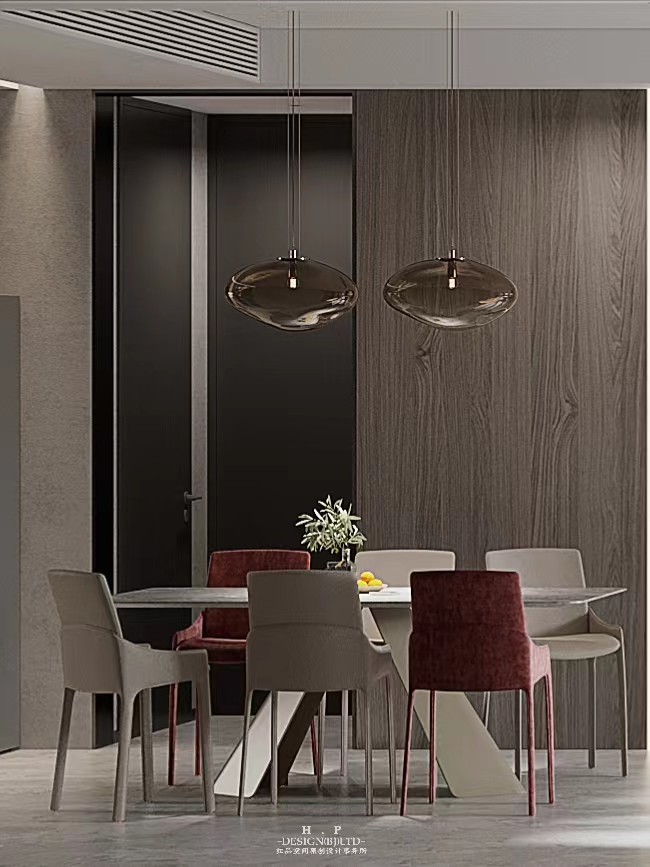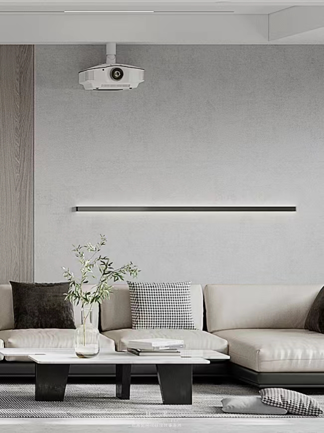 客厅的背景墙采用大理石和木饰面拼接,背景墙一直延伸到餐厅给整个空间带来延伸感。女主人平时喜欢追剧看电影,所以设计师在客厅加入了投影仪,这样平时还可以坐在舒适的地毯上观看电影。
