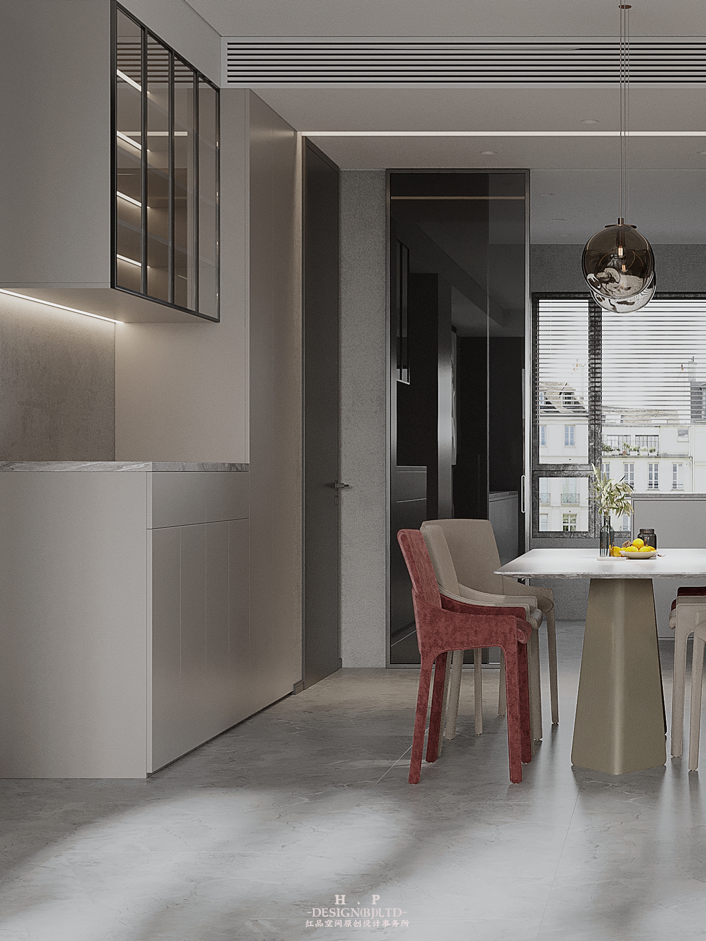 厨房里设计了一个岛台,方便备菜的同时也提升了整个厨房的实用性。为了保证餐厅的采光效果,厨房门采用了玻璃移门,让阳光可以进入餐厅。女主人喜欢盲盒,为了更好地展示各种盲盒,设计师在餐厅的后面设计了一个玻璃展示柜,既美观又实用。
