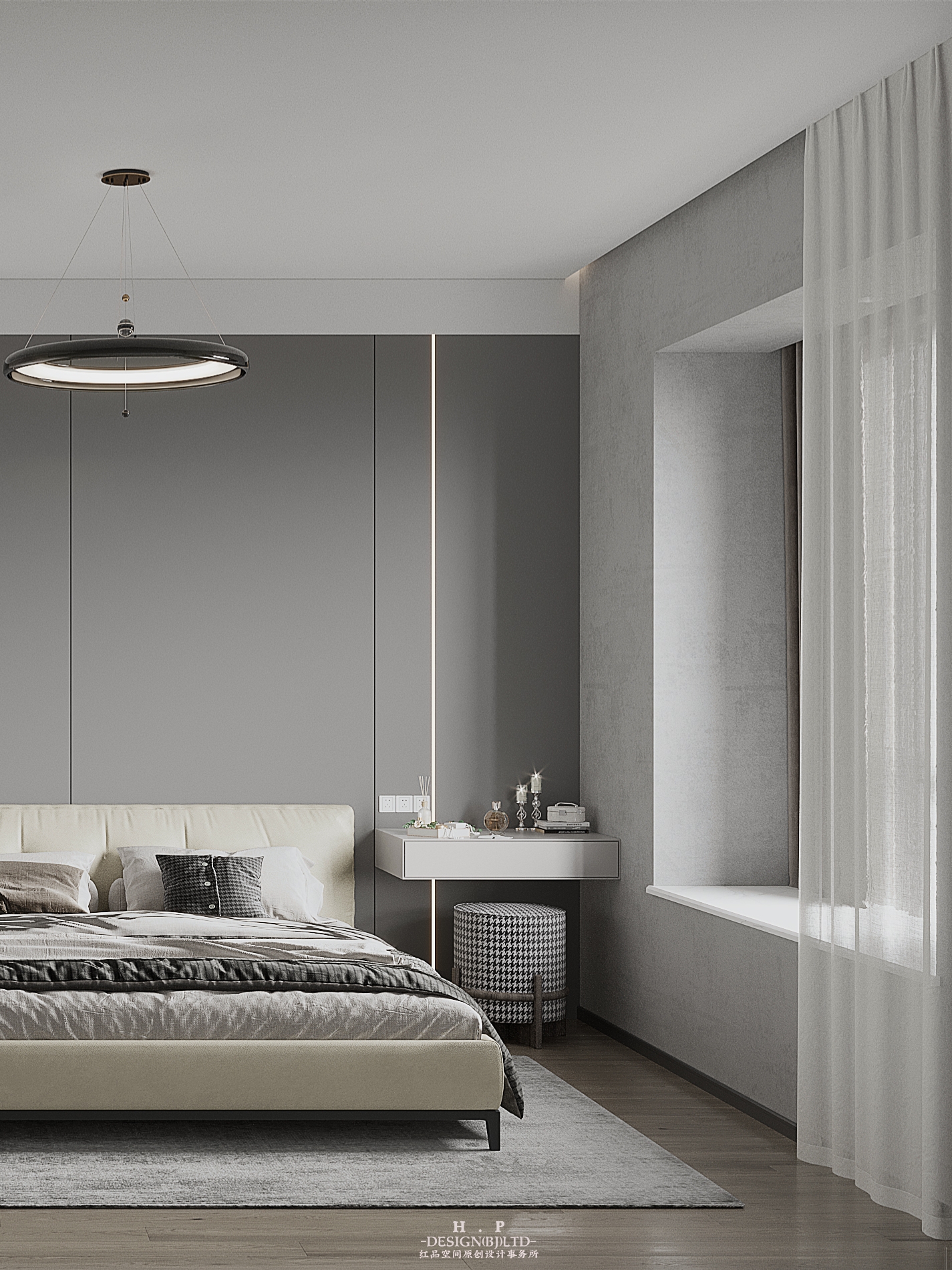 主卧床头的灯带结合壁灯让空间的层次感更加丰富。为满足女主人需求,设计师利用衣柜做了一个开放式衣帽间,让女主人的衣物有一个整洁又方便取用的地方。