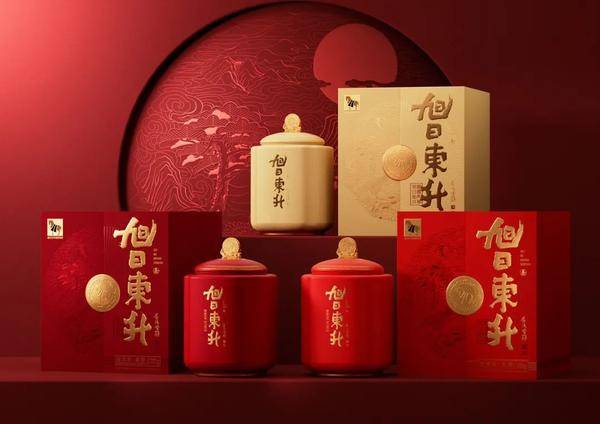 包装以浑厚的中国书法与泰山日出的插画结合。12道芒纹构成同心圆,象征着着一年之中的12个月旭日的光线,环绕太阳的4只神鸟图案象征着春、夏、秋、冬,而神鸟首尾相接向着同一个方向飞翔,代表的正是四季轮回;内罐方身圆罐海浪托举太阳,是海水朝日的寓意。象征着旭日一出正大光明河清海晏。