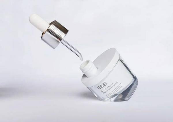 这是精油类产品的包装设计,外形为椭圆形,精准计算,及重力学相关知识在底部设计一个45°斜切角,产品前期可以正常使用,在内料用至一半或是更少时,将精华瓶倾斜放置,改变摆放形态,倾斜瓶体,利用45°斜切平面放置,将料体引流至斜面处汇集,消费者可通过滴管吸取剩余的料体使用,直至用完。精准计算45°斜切面也能保证产品在倾斜放置时的平稳。另一大亮点是小弯角滴管的设计,为了满足用户最大程度的吸取精华瓶底部余料。