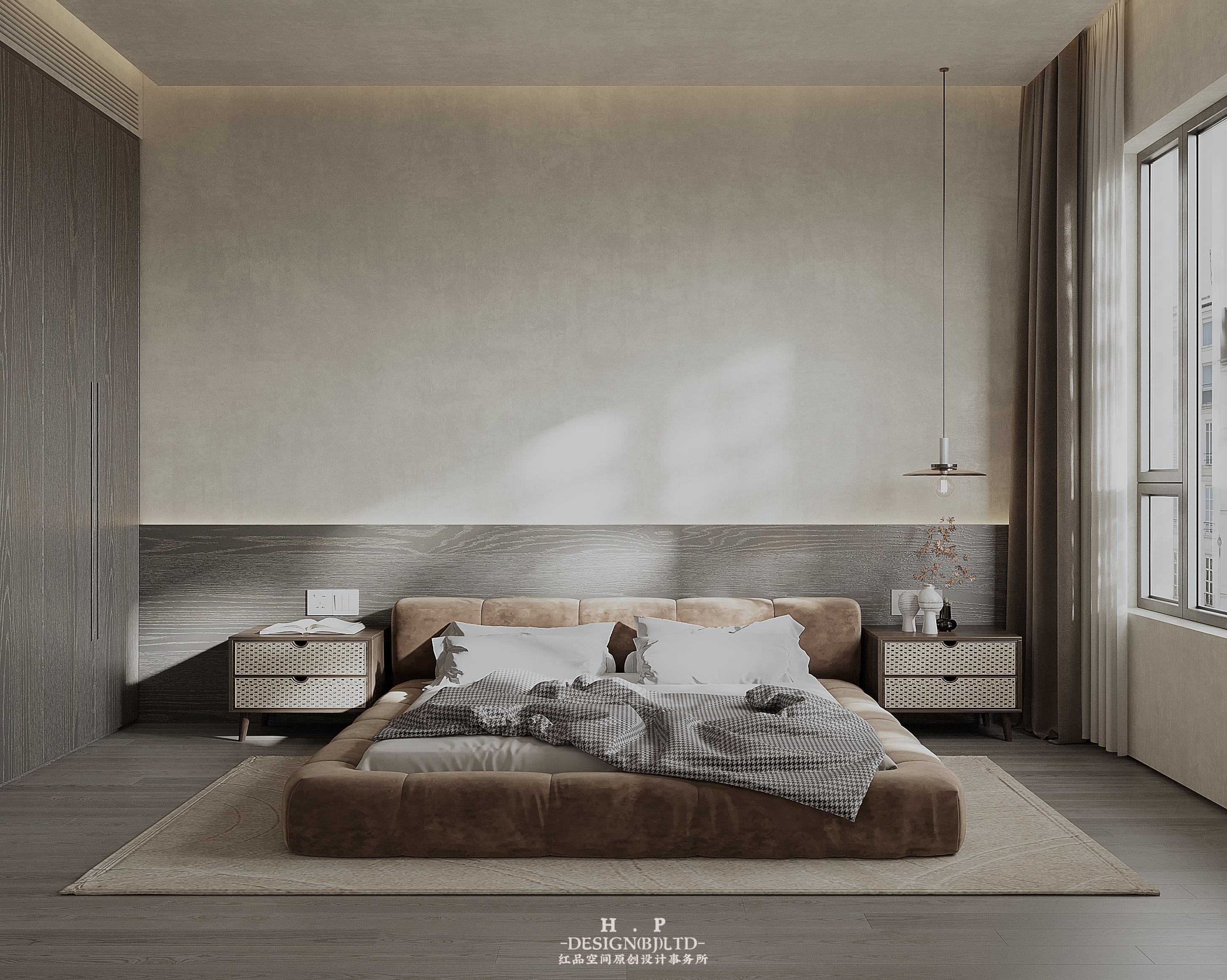 卧室整体空间较小,摆放矮床可以使人的视觉重心降低,从而达到放大空间的效果。衣柜、地面、护墙板颜色统一让空间更加宽敞明亮。