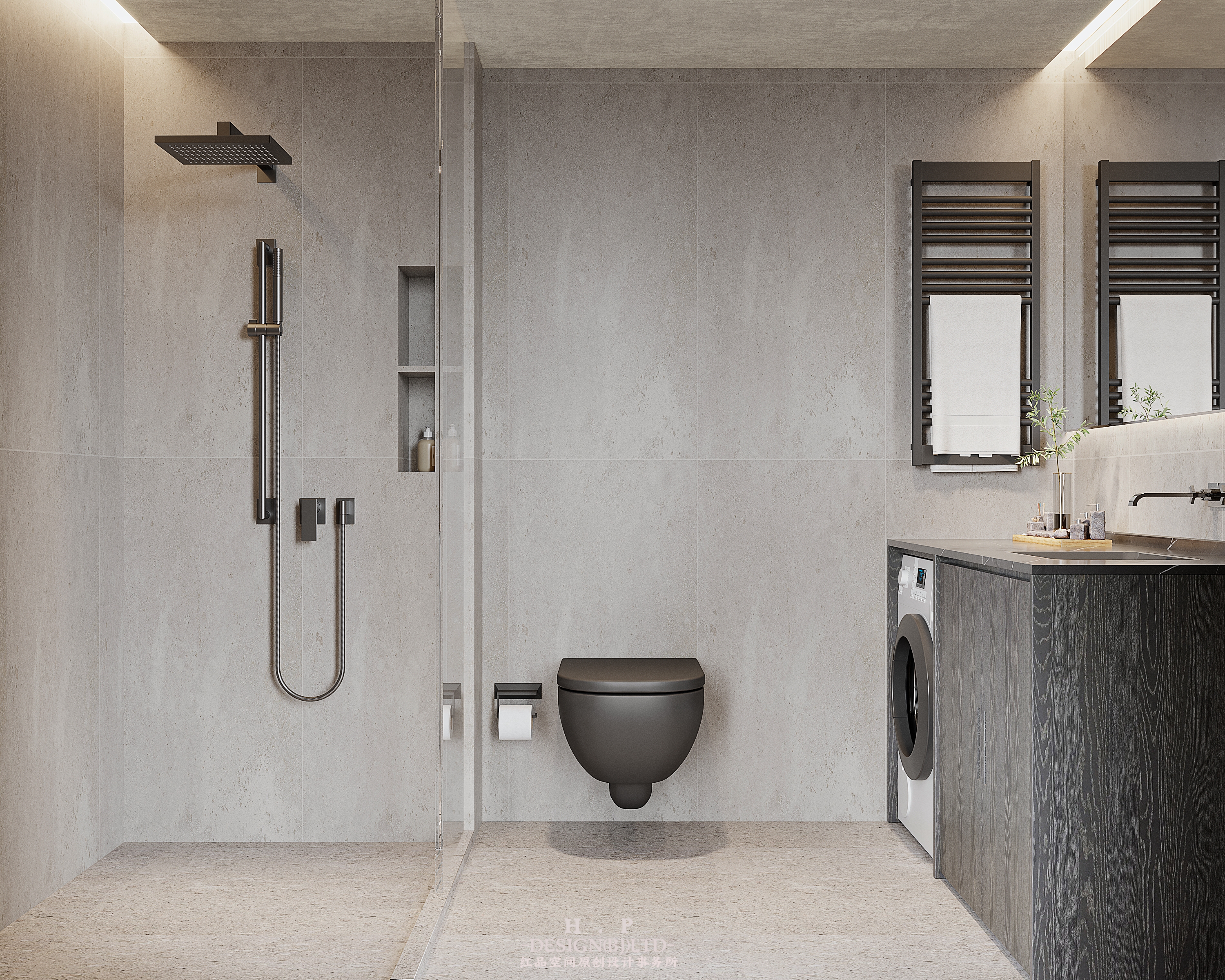 卫生间整体采用了微水泥砖让空间保持统一,黑色的洁具更显质感。