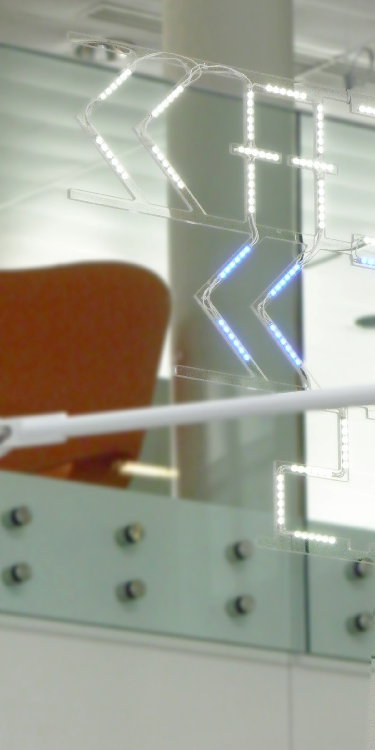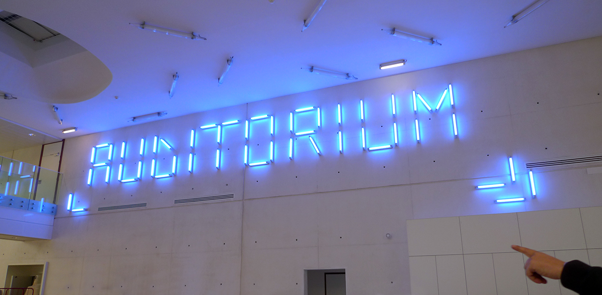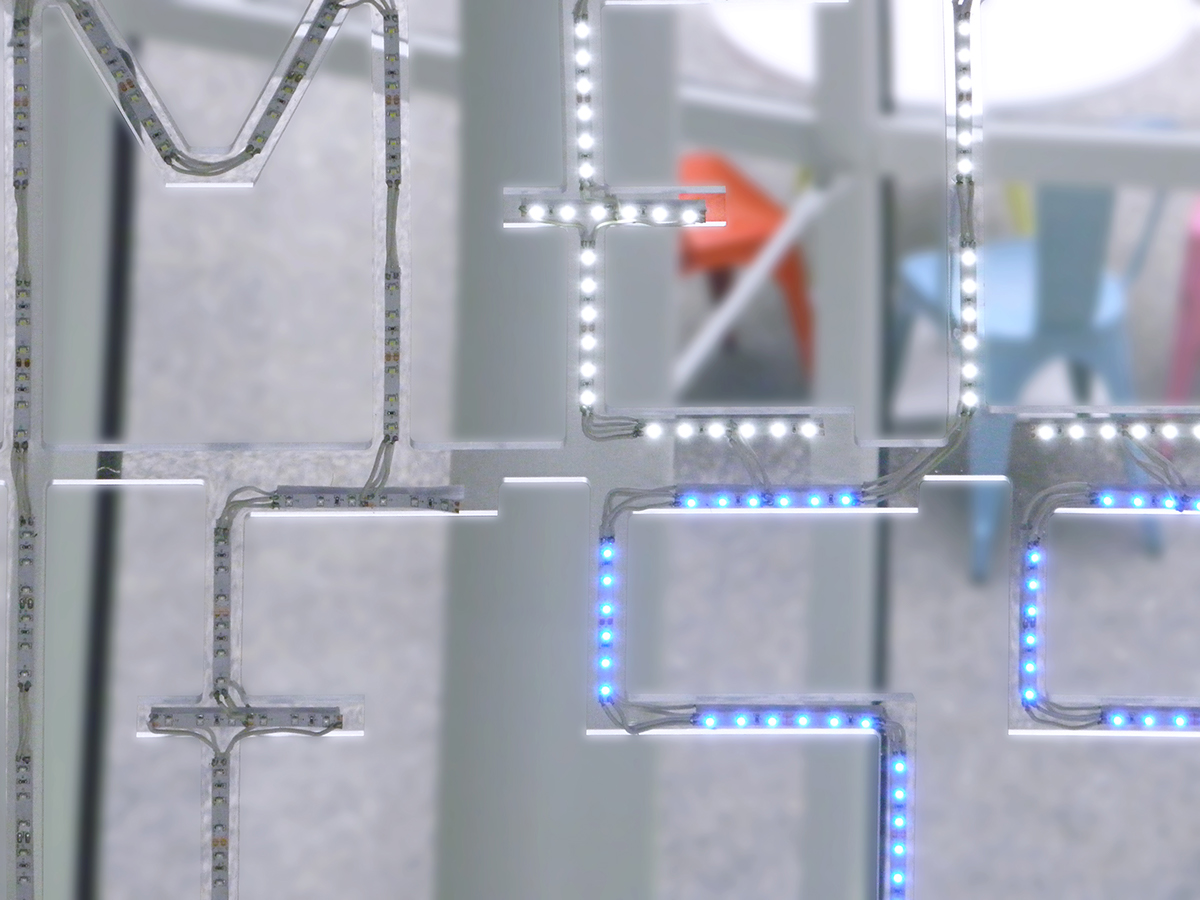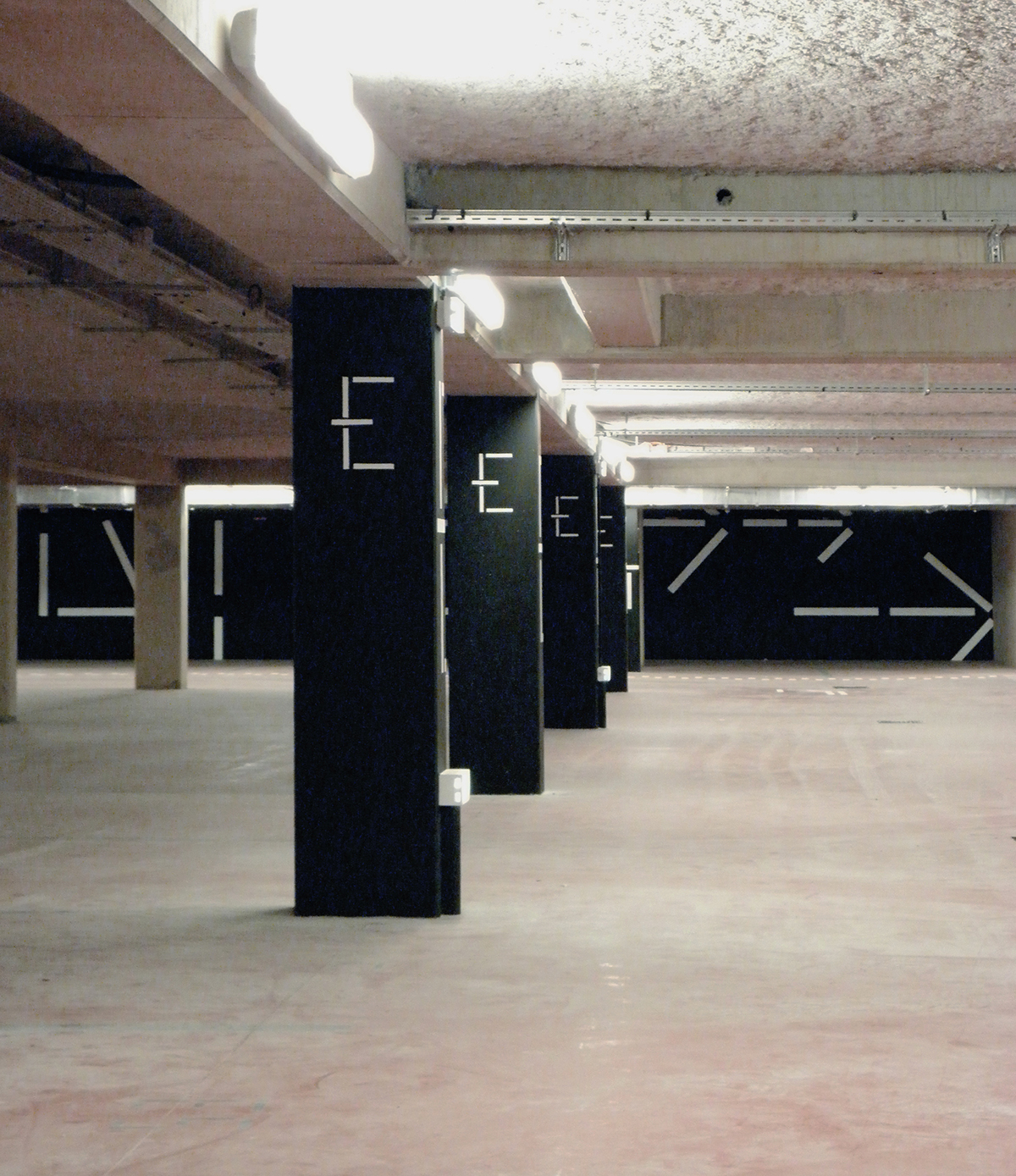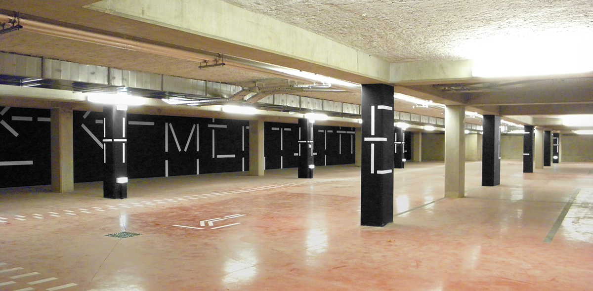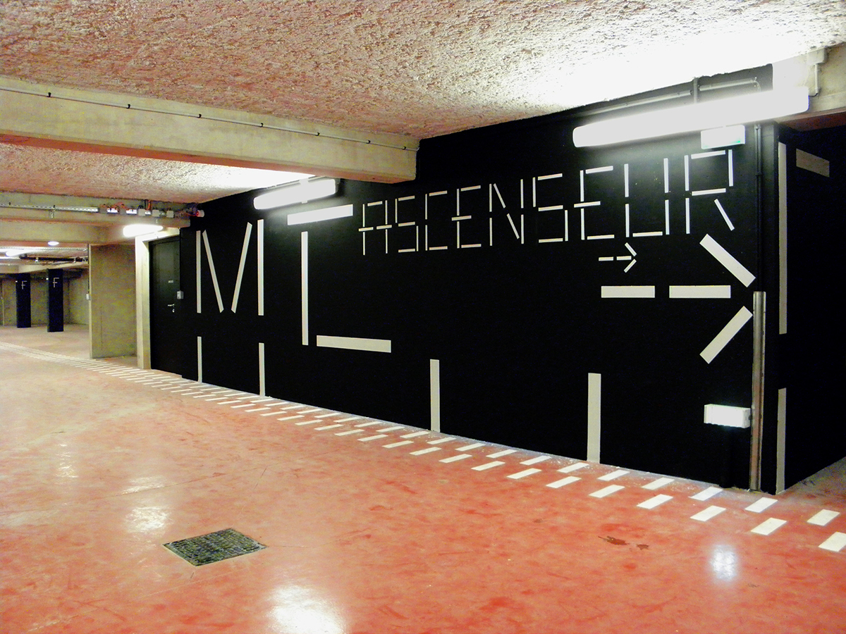 基于建筑特点,Jérôme Mignot设计了巨大的发光字名称,蓝色的灯光使其更具科技感。内部信息均由线段式信息构成,灵感来源于建筑外观,强调了线条的结构美。地库采用黑白配色,简约的信息打造了一致的整体性。