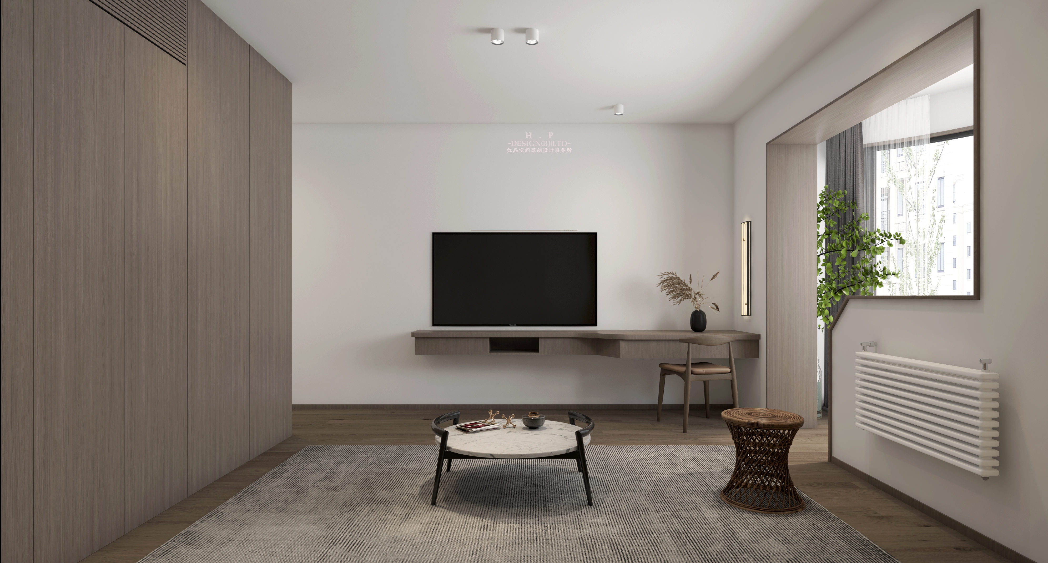 客厅做了整排柜子,冰箱、空调和洗衣机都嵌入柜体,悬挑电视柜更显轻盈,电视柜与书桌相连更节省空间,圆几的摆放也能让老人避免碰撞。由于层高不够,设计师去除了传统吊顶,采用明装射灯+无主灯设计让空间显得更开阔。