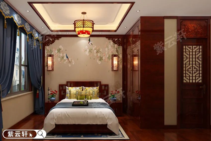 简化了的空间布局在满足休憩功能的同时,提供了一个令人放松的家居空间。白色床单与窗帘等提亮空间色彩,同时避免了颜色过于单一,红木衣柜立于一旁,在满足收纳的同时,展现中式卧室的豪华大气。别墅装修中的每一个角落都透着浪漫,作为婚房也非常不错哦。