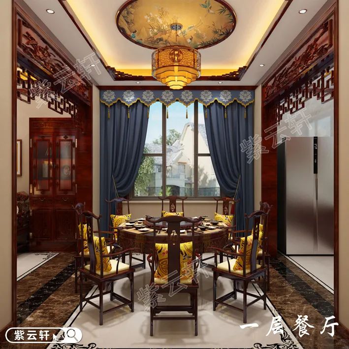 两侧中式特点明显的木制格栅垭口,不仅起到装饰的作用,更代表着美好的寓意。红木餐桌搭配官帽椅,大气优雅的同时,感受弥漫的木香,与美味佳肴相结合,更是一片美景。中式设计并没有将大量的传统元素进行堆砌,更能给人一种简约美感。