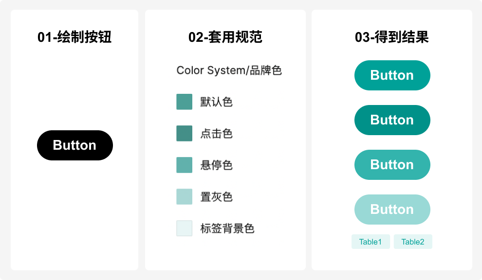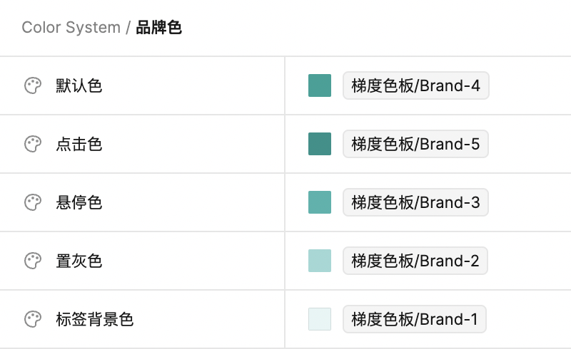 定义颜色的使用场景,然后将场景与梯度关联。比如这里就定义好了默认、点击、悬停、置灰等使用场景,这样不论哪个设计师拿到该份规范,都可以快速准确的绘制出该颜色下按钮的各个状态。