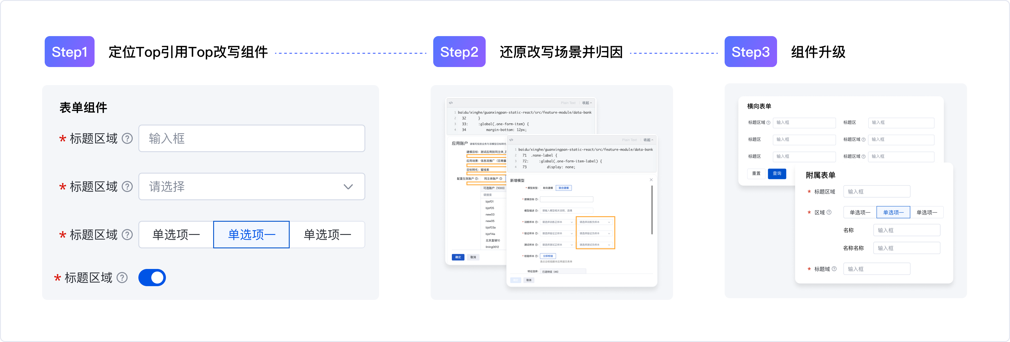 3.针对不同原因导出解决手段进行组件升级:最后,根据上述问题,逐一进行设计和研发升级。升级后的表单组件再被业务方引用时,免去了改写的成本,平均单次引用可节省约1h的研发耗时。