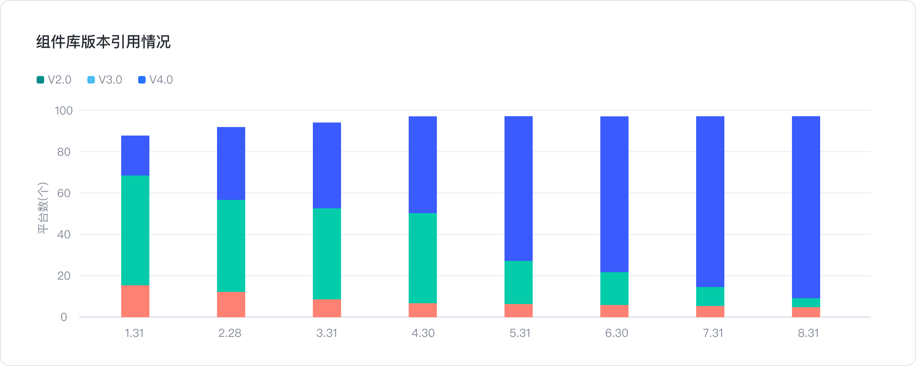 2.组件库版本引用占比-各平台引用的是哪个版本的组件库(组件库每升级一次,即为一个新版本)。