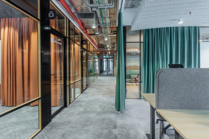进入办公室内部的充足日光由安装的温度和照明强度控制系统提供支持,从而减少电力消耗。大量的绿色植物和专门设计的休闲区也支持了更好的员工福祉和效率。#专业办公室设计#