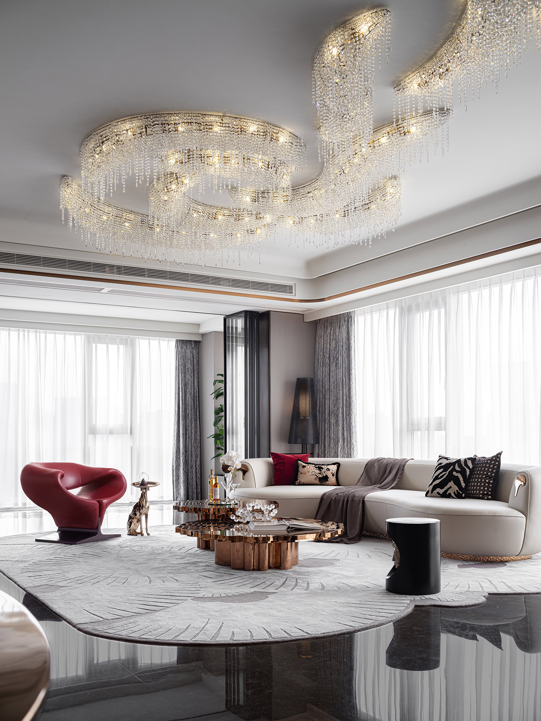 客厅从多个层面强化了曲线元素,范思哲金艺术茶几、红色飘带椅、柔软手工地毯以及自由曼妙的沙发围合出社交区域,艺术格调自然铺开,增添灵动而柔和的场域力量。