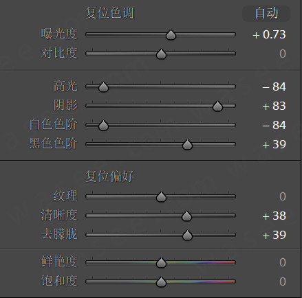 这里可以和大家介绍一下各个设置的内容。曝光顾明思议就是整体明亮的意思,往左拉将整个画面变暗,右拉将画面提亮。对比度的意思是明暗对比,也即是,如果增强明暗对比,亮的地方会更亮,暗的地方更暗。高光的意思也很好理解,就是亮度特别高的地方,像这张图的右上方的白色部分就是很明显的高光。