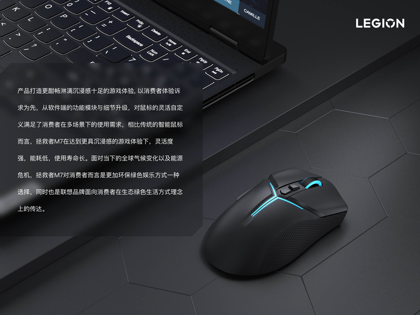 产品打造更酣畅淋漓沉浸感十足的游戏体验, 以消费者体验诉求为先,从软件端的功能模块与细节升级,对鼠标的灵活自定义满足了消费者在多场景下的使用需求,相比传统的智能鼠标而言,拯救者M7在达到更具沉浸感的游戏体验下,灵活度强,能耗低,使用寿命长。面对当下的全球气候变化以及能源危机,拯救者M7对消费者而言是更加环保绿色娱乐方式一种选择,同时也是联想品牌面向消费者在生态绿色生活方式理念上的传达。