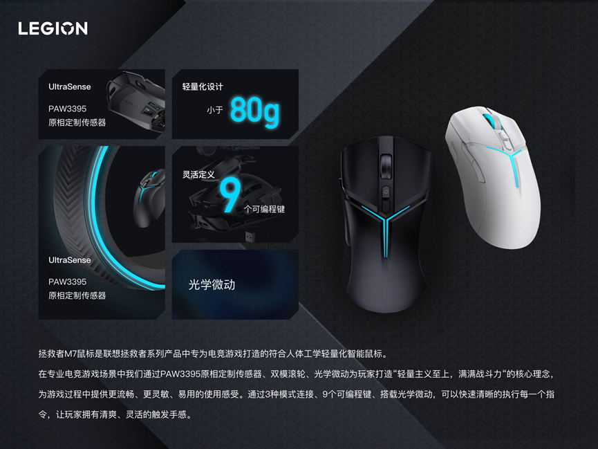 联想拯救者M7鼠标是联想拯救者系列产品中专为电竞游戏打造的符合人体工学轻量化智能鼠标在专业电竞游戏场景中我们通过PAW3395原相定制传感器、双模滚轮、光学微动为玩家打造“轻量主义至上,满满战斗力“的核心理念,为游戏过程中提供更流畅、更灵敏、易用的使用感受。通过3种模式连接、9个可编程键、搭载光学微动,可以快速清晰的执行每一个指令,让玩家拥有清爽、灵活的触发手感。