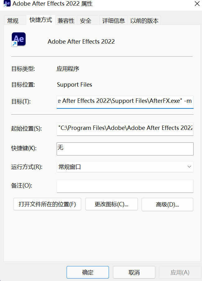 要解决此问题需要回到最开始,取消之前的兼容性运行,那么现在还是出现Stardust运行崩溃的问题。解决此问题的方法就是,你现在需要双开AE2022,双开方法就是在AE2022软件属性中加上 -m(注意 -m前面有空格)。