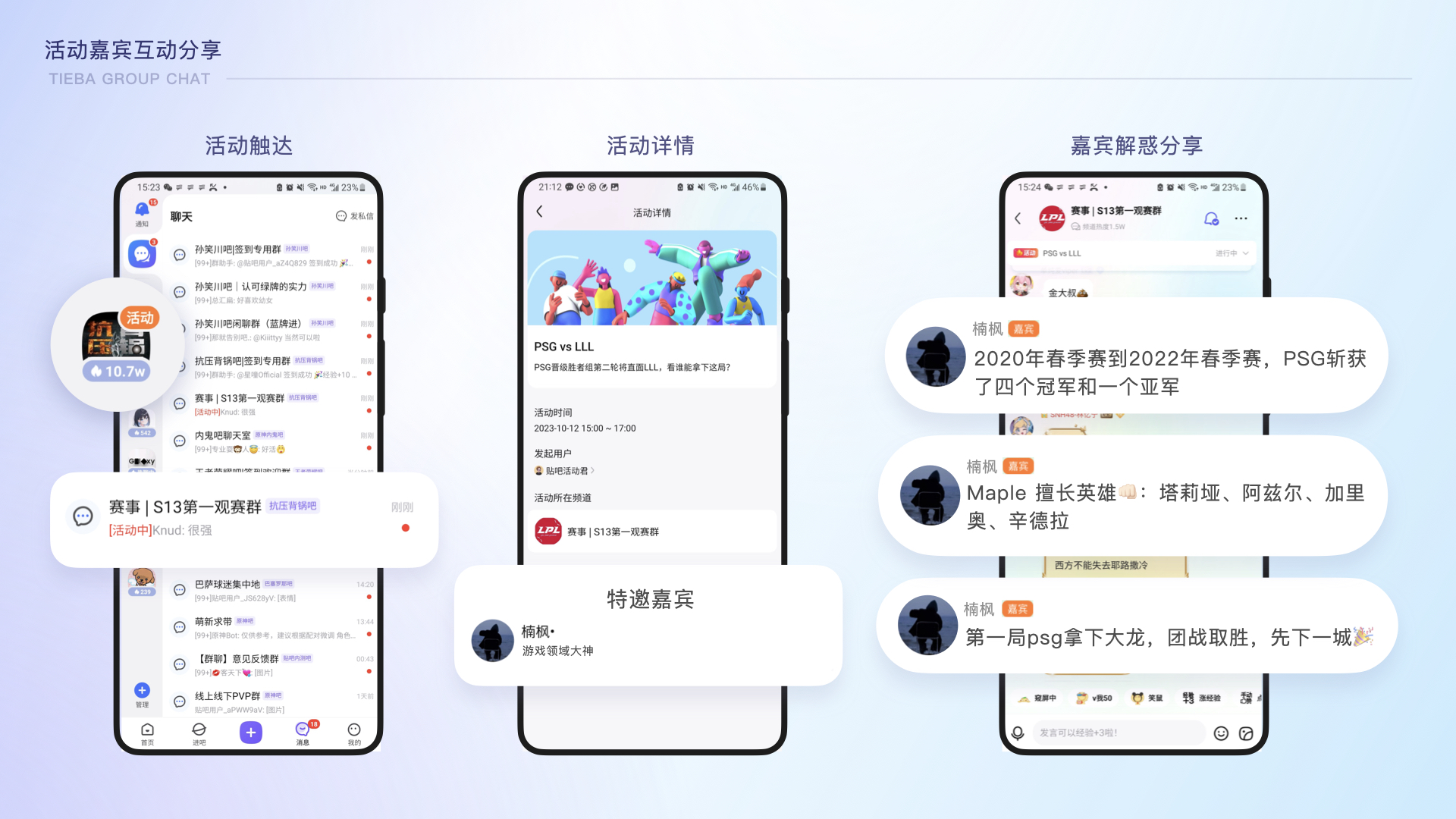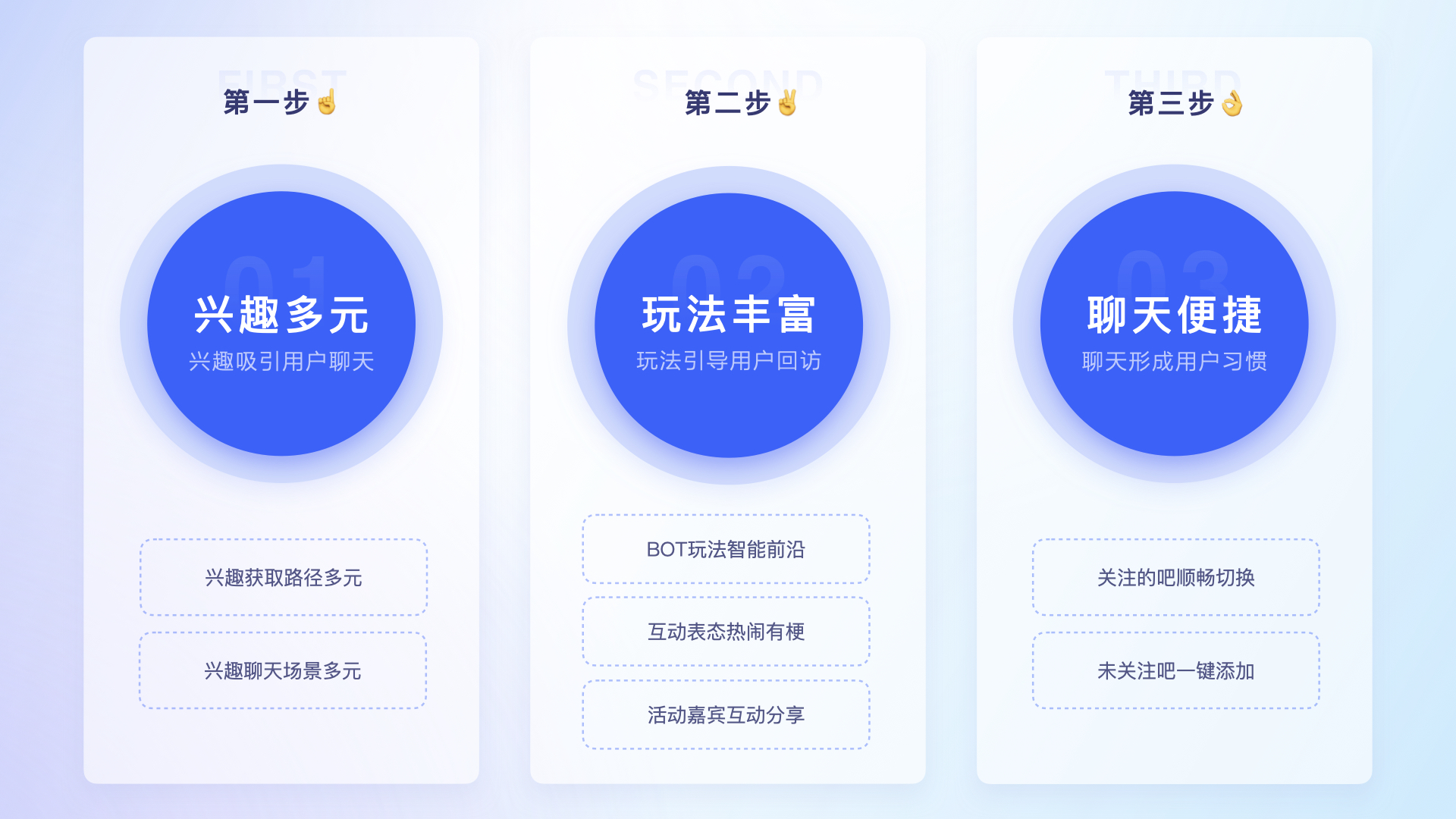 竞品群聊为用户提供共同兴趣互动空间,带动用户互动意愿,提升产品DAU,当我们在做群聊时重点思考怎么让用户在贴吧玩起来呢,回顾整个项目,我们总结了兴趣多元、玩法丰富、聊天便捷三个步骤,更好更快的搭建人人喜爱的群聊。