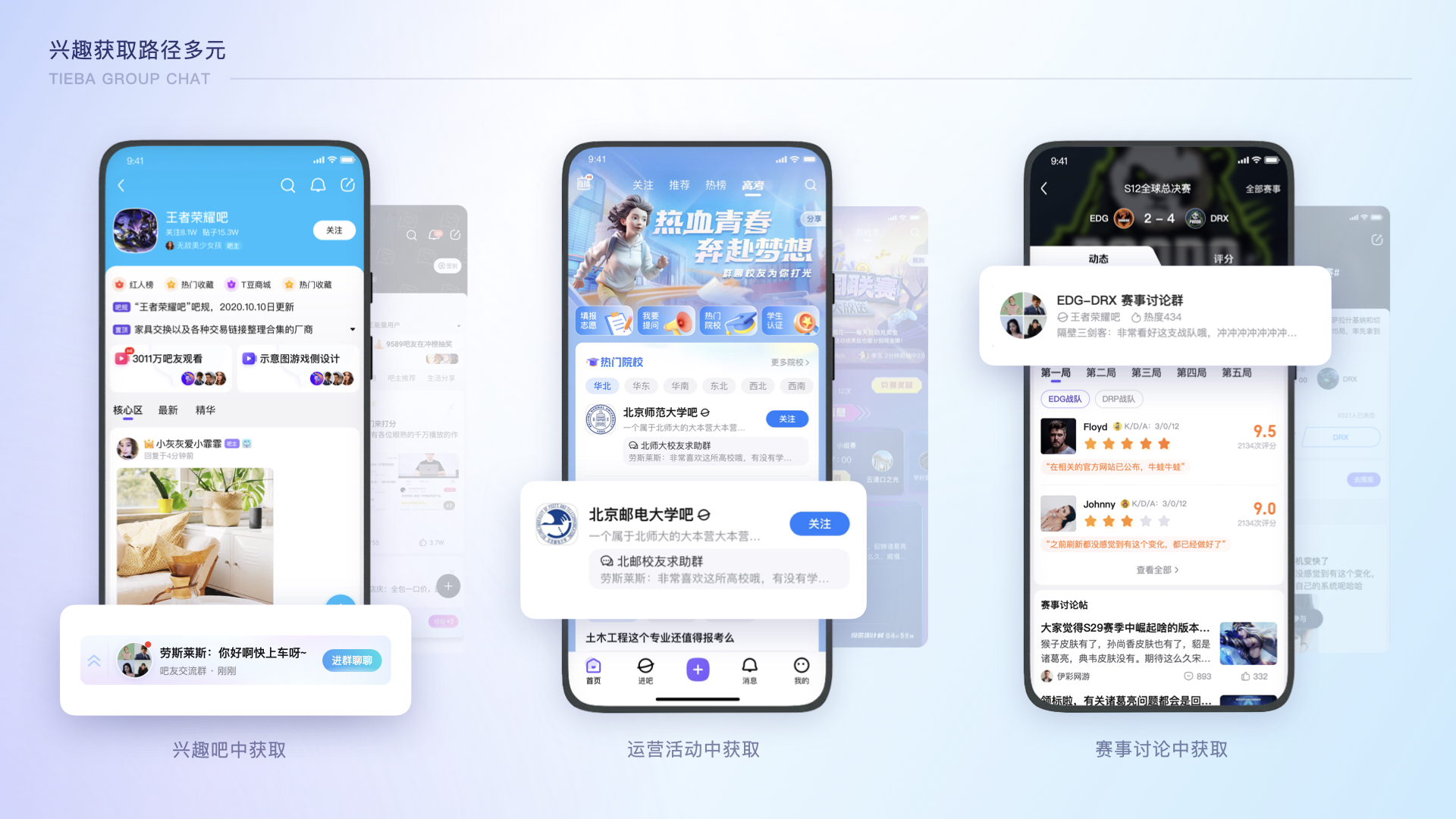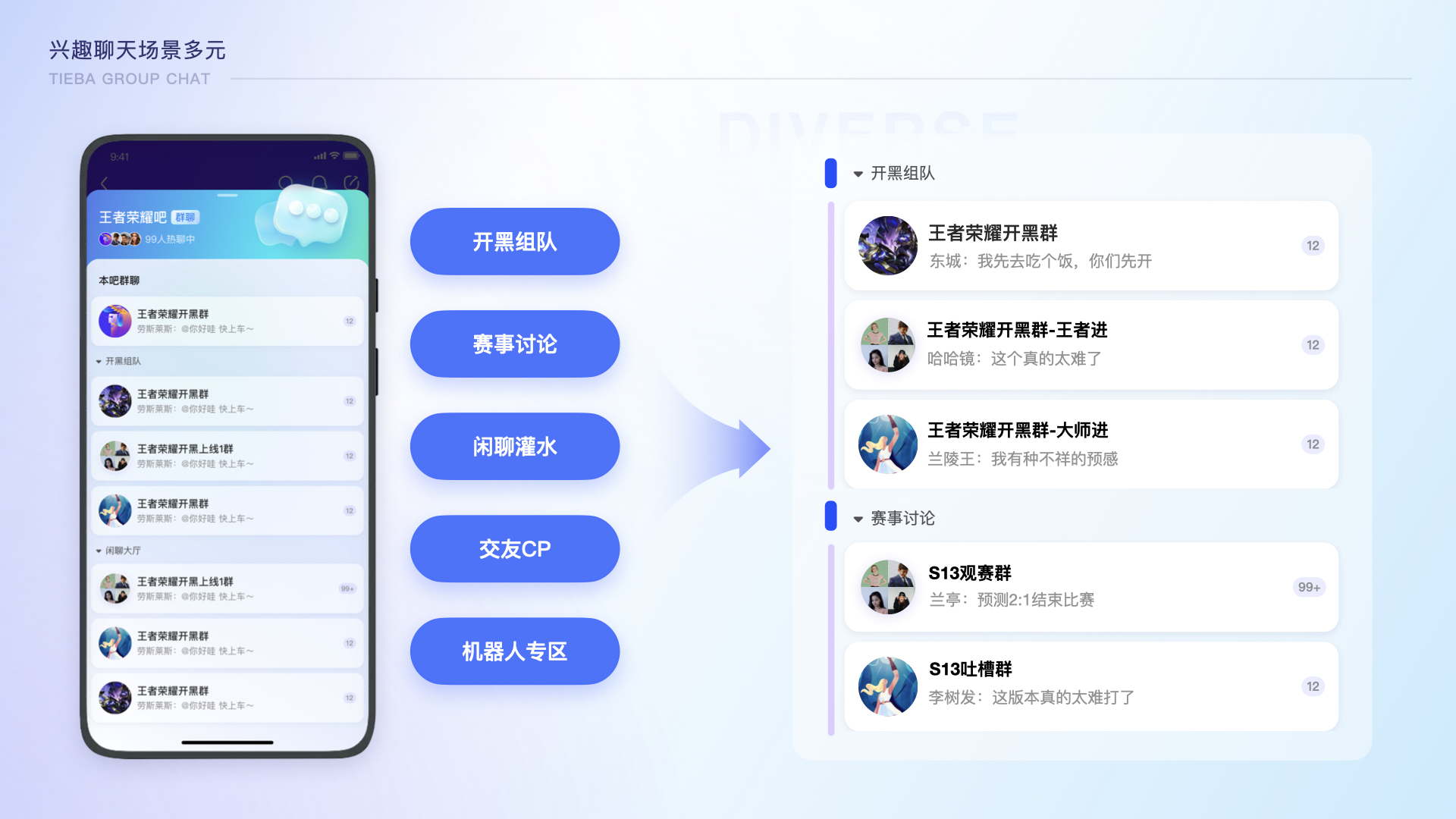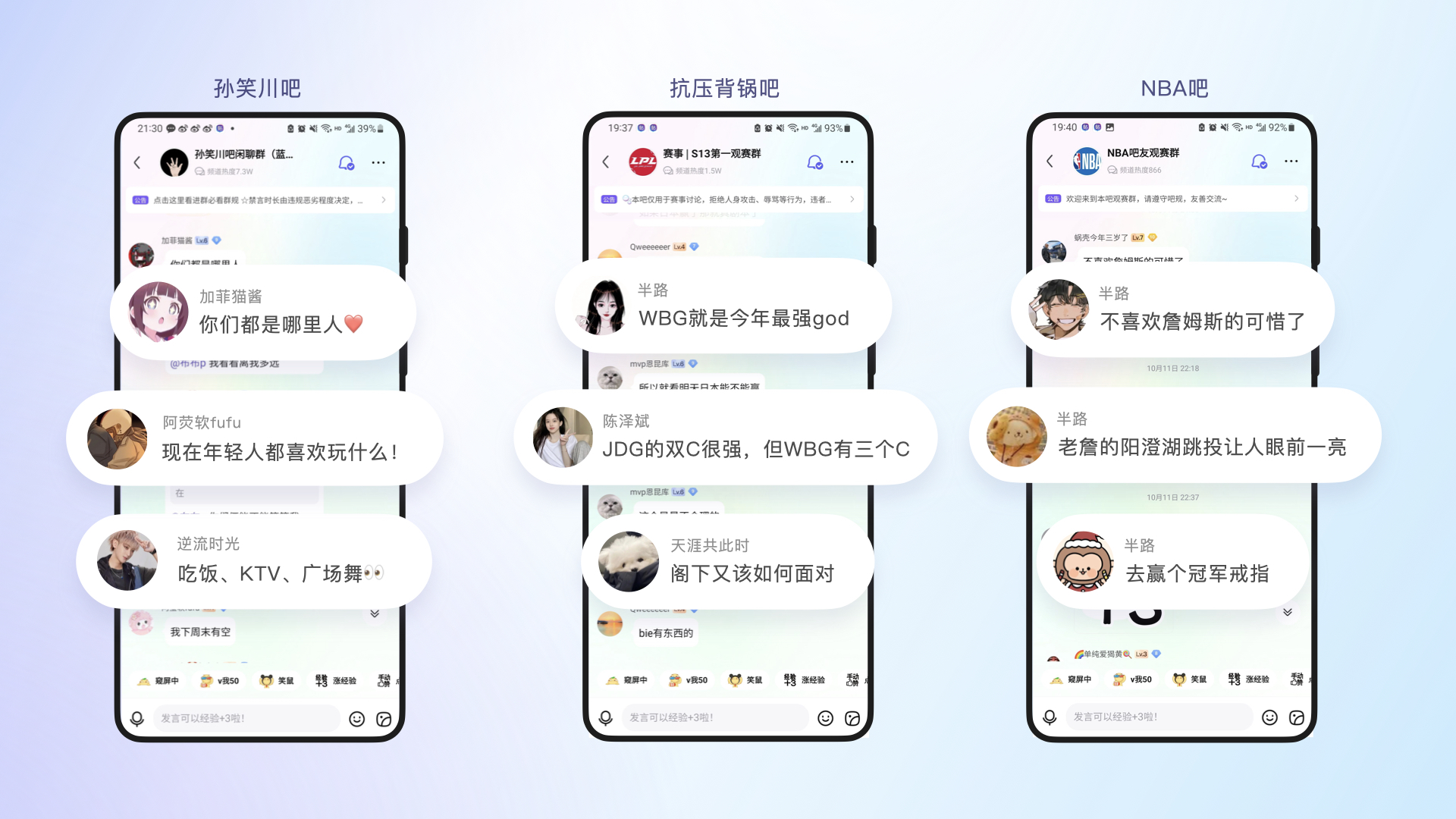 贴吧等社区产品通过垂类内容将用户聚合在一起,用户在其中讨论诸如追星、游戏、体育、生活等话题,群聊同样是一种兴趣聚合方式,结合群聊高效的互动能力可以放大垂类兴趣优势。