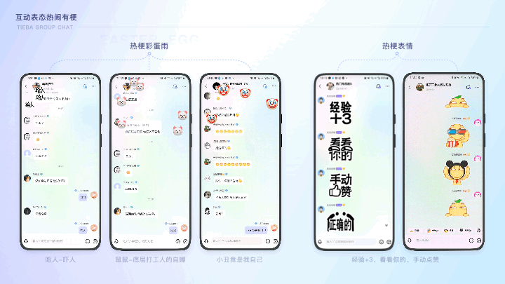 哈人(吓人)、鼠鼠(社会底层打工人)、小丑竟是我自己、V我50等数十种彩蛋雨,回复关键词触发飘屏效果,经验+3、看看你的、手动点赞等热梗大表情,同样使用使用用户在回贴中最常用的语言热梗互动变得有趣。