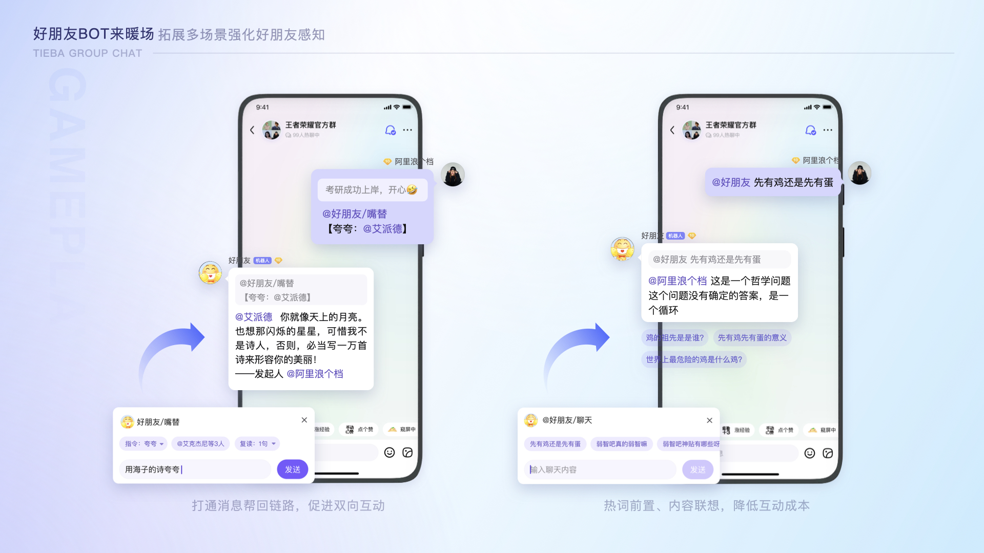 群内打通消息帮回链路,你可以让好朋友帮用户夸夸、怼怼群友。通过好朋友经常聊天的热词前置、消息内容的联想,吸引用户点击,只要用户不停,好朋友可以一直陪你聊下去。