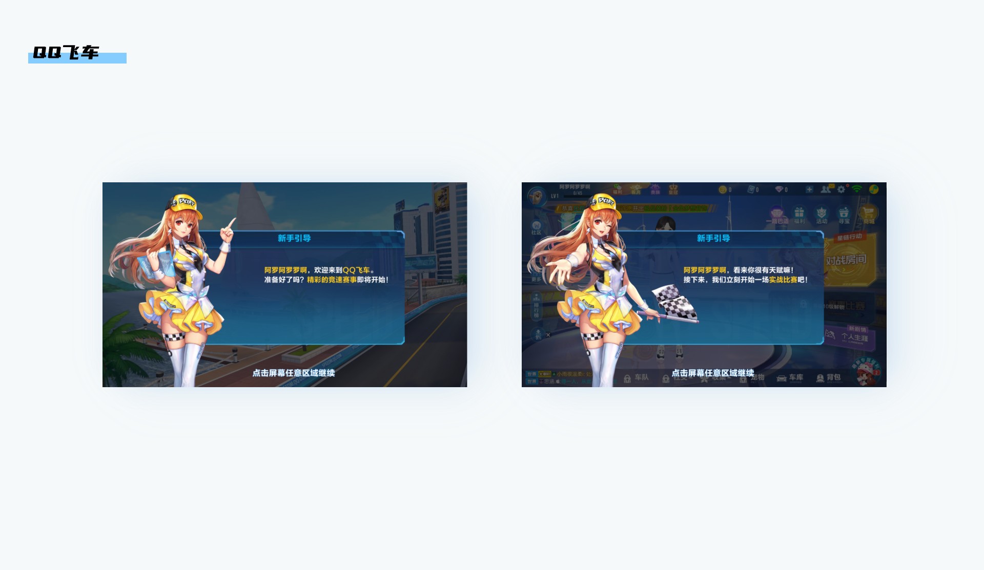 QQ飞车使用不同动作的小橘子,作为新手的引导人。作为游戏的代入感很强。