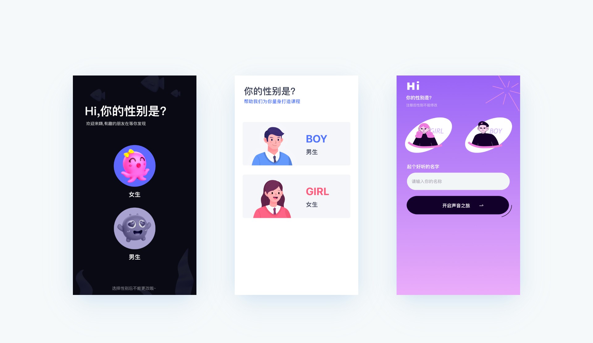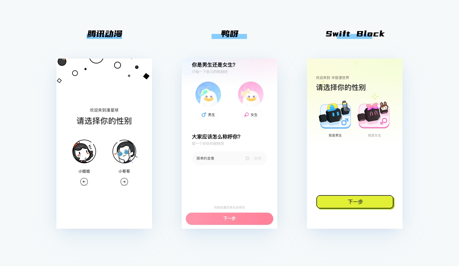 1.与单纯表格或者按钮切换的性别界面对比。在首次登录时弹出具有插画选项的性别界面,更加具有仪式感。