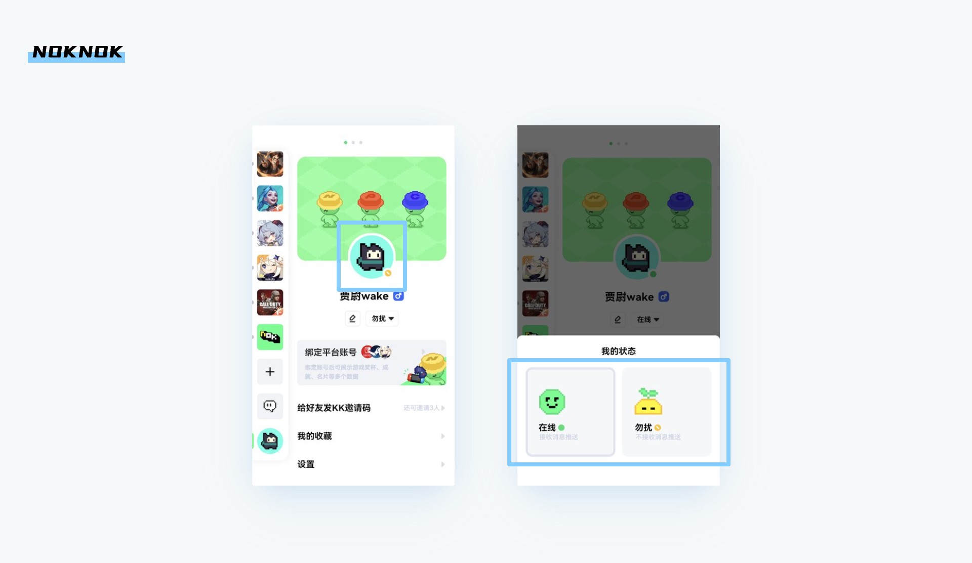 用户挑选社交状态的时候,用更复杂的插画代替图标,能更直观地表达该状态/动作的意思。且noknok的插画均使用像素画,在App中识别度更高。