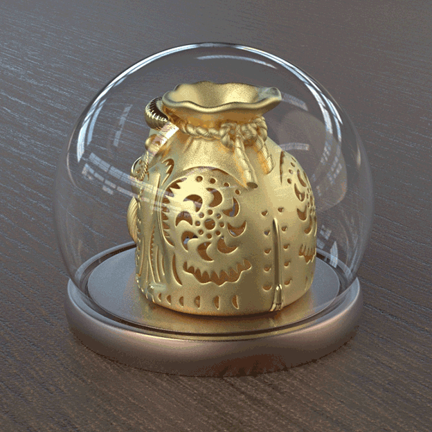此作分为吊坠和潮玩两个部分。2023年为癸卯年,生肖为兔,因此又被称为卯兔之年,从汉代开始,兔子和月亮就结下了不解之缘,古时兔常与月亮一同出现,因此兔亦被称作“明月之灵”。生肖兔吊坠作品主体为一个葫芦造型的萌兔,取福禄之意;兔子坐在月亮上抬手摘着星星,月亮前端、脚下的彩云共有五颗星星。后方五角星底座将吊坠串联在一起;下方悬挂着兔子的食物和与兔有关的中外节日物品,如中秋月饼(口味可定制替换,甚至可以写名字)、复活节彩蛋,这些在后续是可以延伸设计出更多的可替换部件,比如春节灯笼等等。兔子衣服、月亮背面和两颗大星星都镶嵌矩形彩色宝石。潮玩款脚下的彩云是五角星底座(俯看)。