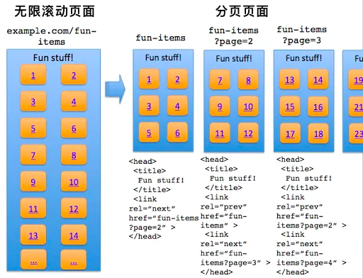 搜索引擎优化(SEO)不太喜欢无限滚动。就像Google Search Central Blog所写的:网络爬虫不能很好地模仿人工用户的行为,比如滚动下拉或点击加载,所以爬虫无法获取信息流中的所有内容,这会导致这些内容无法出现在Google的搜索结果中。要使无限滚动的页面符合“搜索引擎友好”,必须将其转换为分页组件的页面