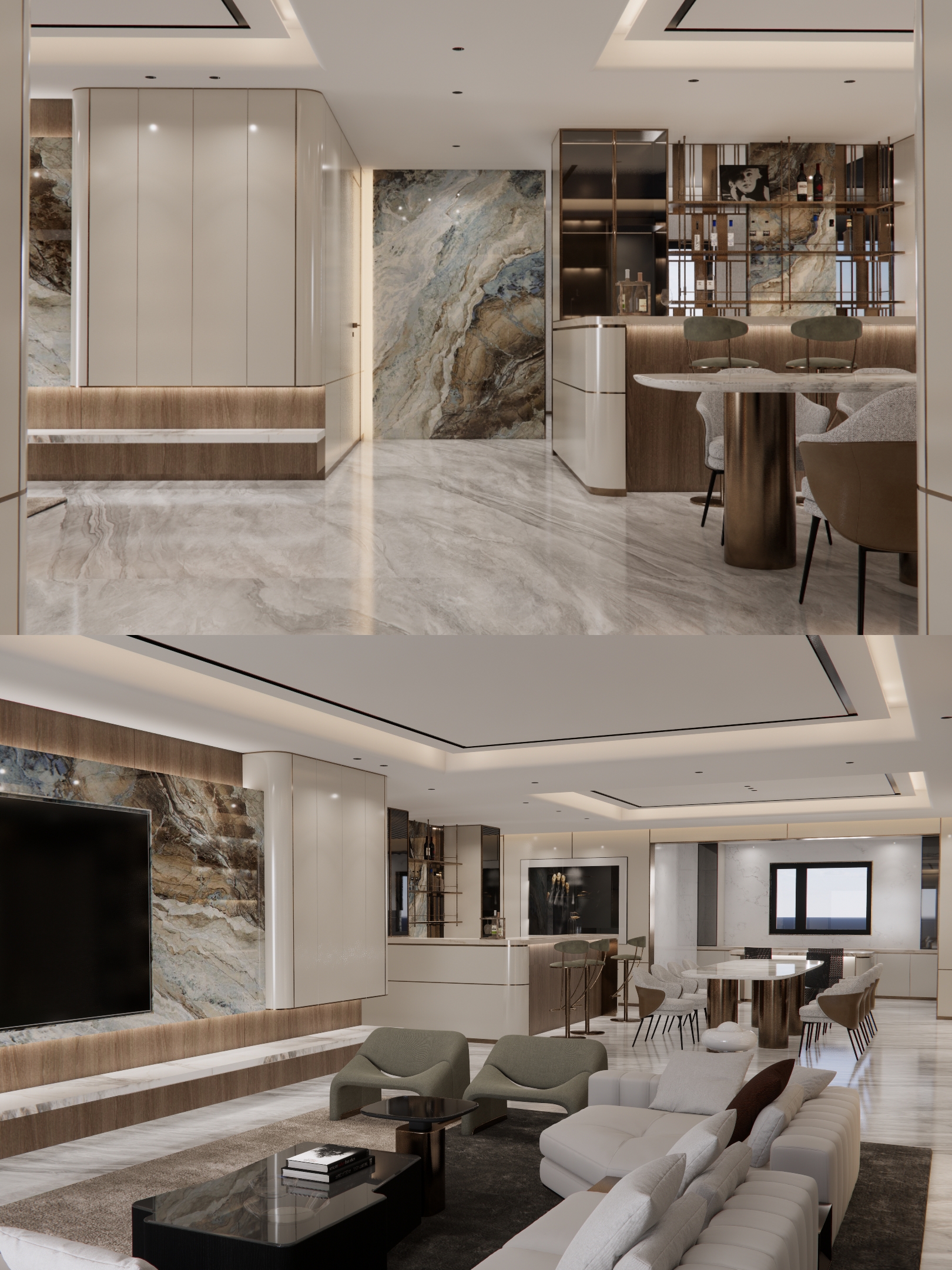 客餐厅地面整体采用900*1800大理石密缝铺贴,整体空间低调简约又质感满满。客厅背景墙采用了岩板+木饰面的拼接,浅色系的模块沙发营造了空间的轻盈感。