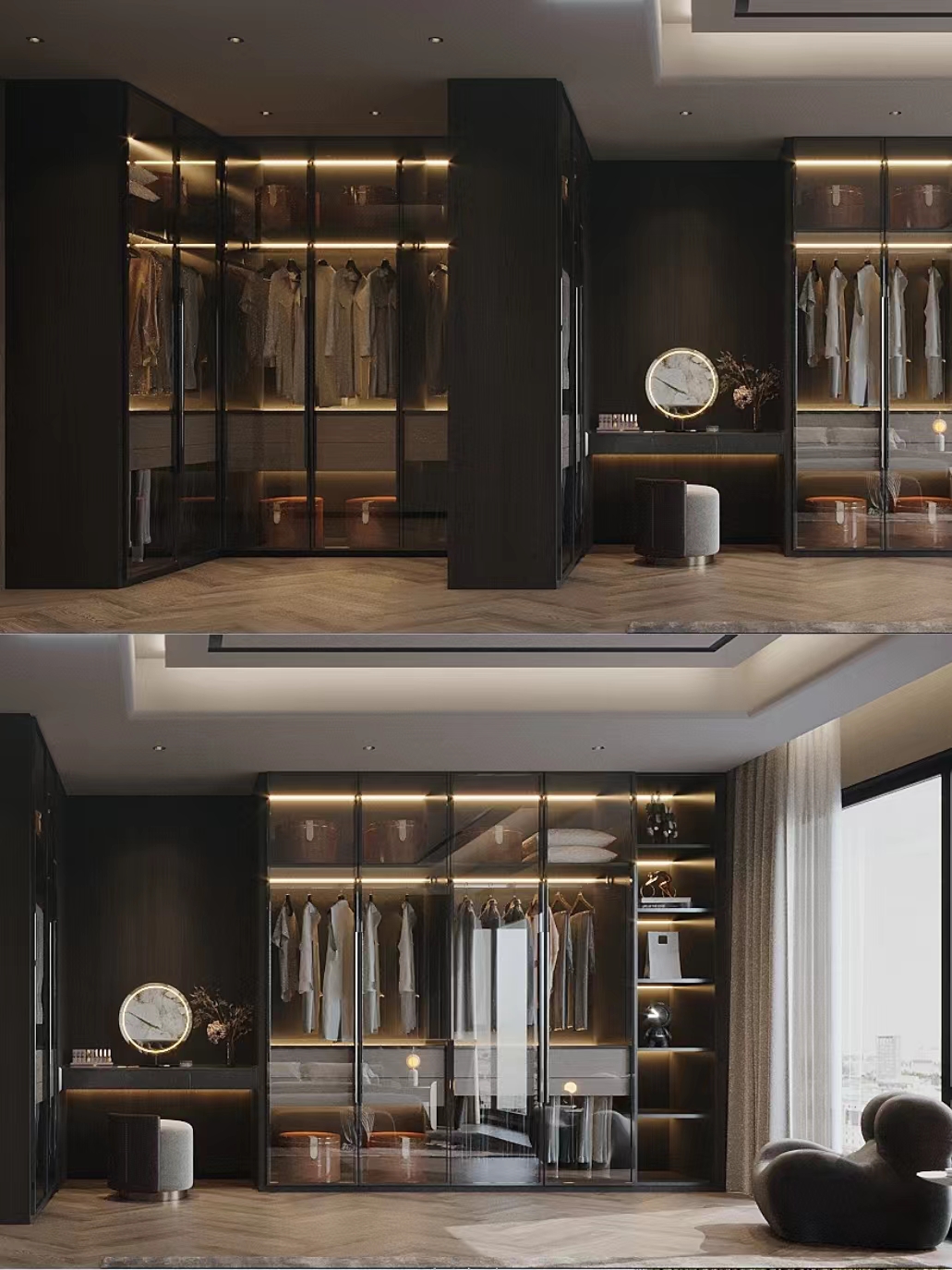 老人房整体采用浅色系明亮通透。女儿房采用了撞色设计,整排深色玻璃衣柜,时尚又大气。