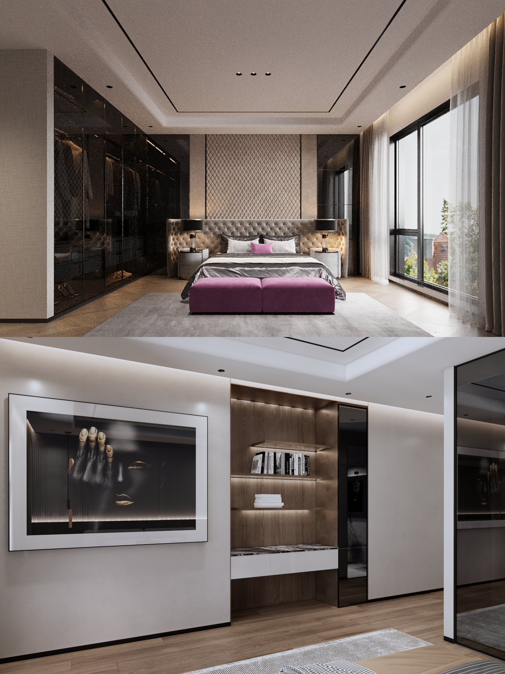 卧室整体与客厅保持一致的低调质感,首先映入眼帘的是一张柔软舒适的床,配上柔和的灯光,温馨舒适。