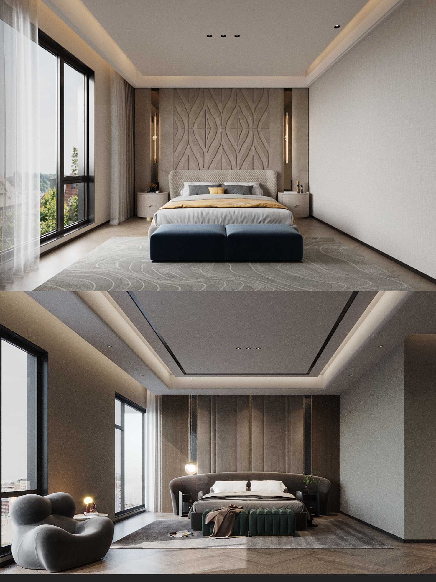床头背景墙的软包与木纹护墙板拼接,搭配高级灰地毯和暗色软装家居,视觉上的撞色呈现出空间的层次感。